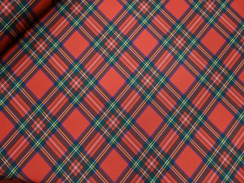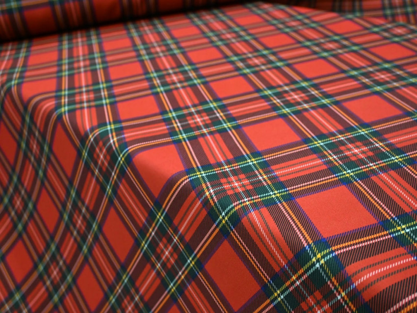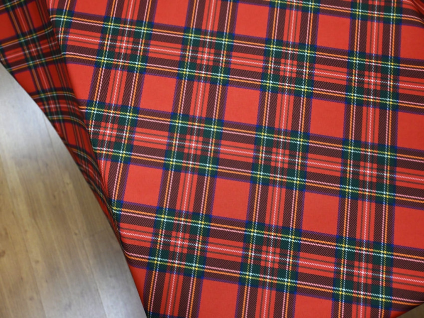 Mantelería de poliéster 100% con estampado escocés en rojo navideño. Tejido resistente, fácil de limpiar y con cuerpo. Perfecta para vestir mesas con estilo clásico y festivo. Ancho: 150 cm | Peso: 235 g/m².