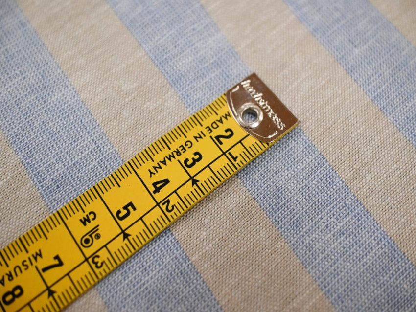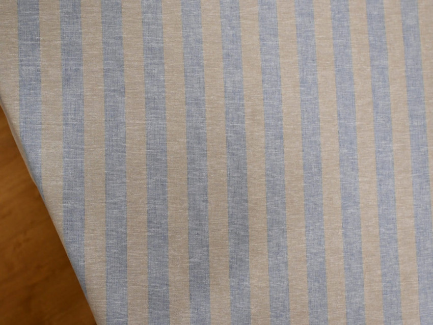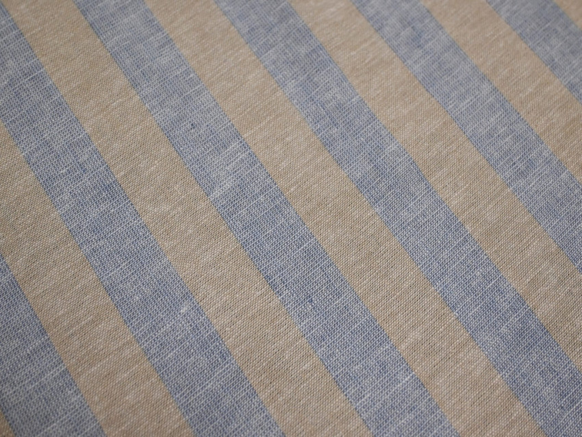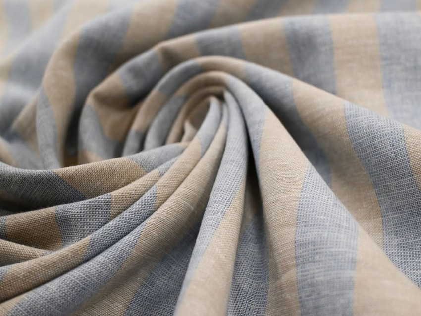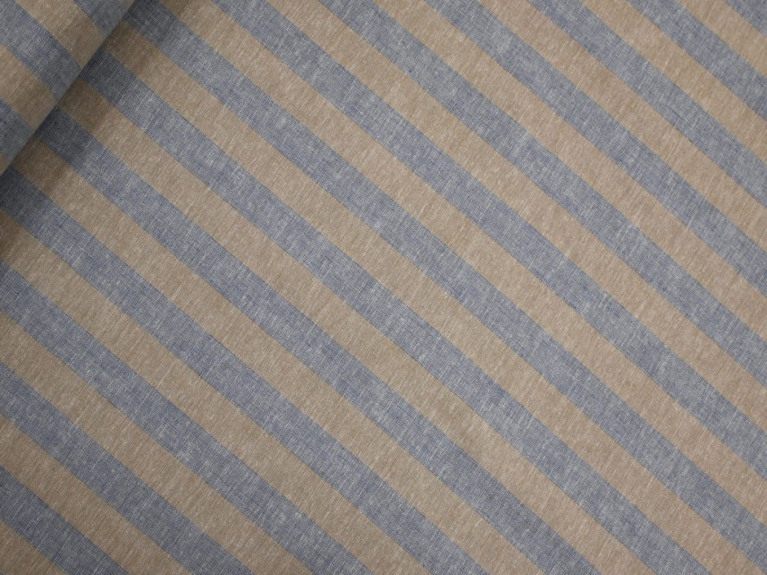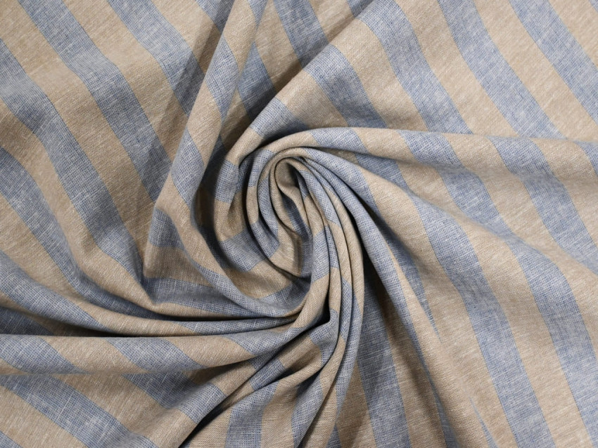 Tejido mezcla lino y algodón con elegante diseño de rayas en tonos naturales y azulados. Fresco, resistente y con caída ligera, ideal para prendas de verano y decoración. Ancho 140 cm, 150 g/m².