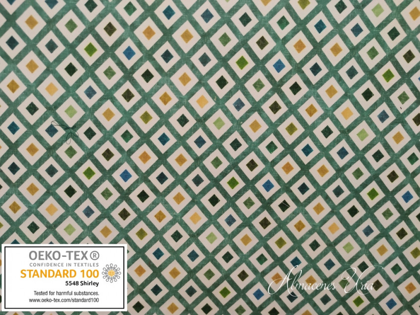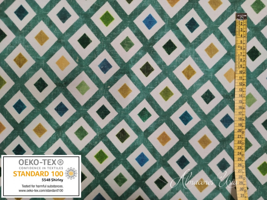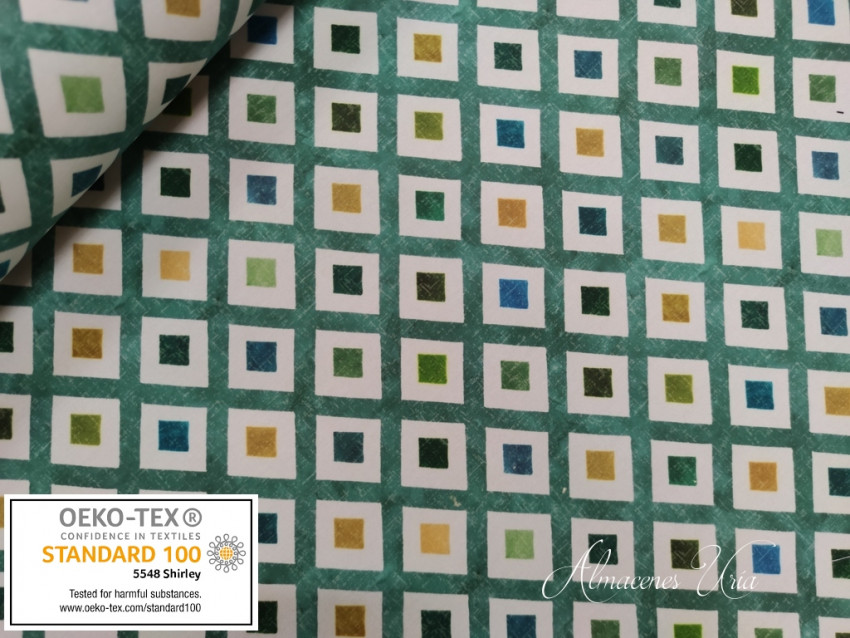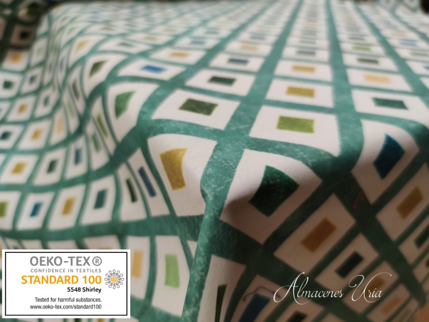 Loneta estampada con baño de teflón y acabado resinado de muy buena calidad, con cuerpo, impermeable y fácil de limpiar las manchas con un paño húmedo y jabón.