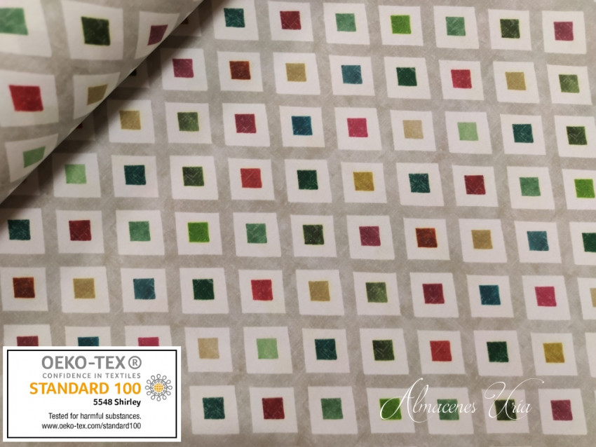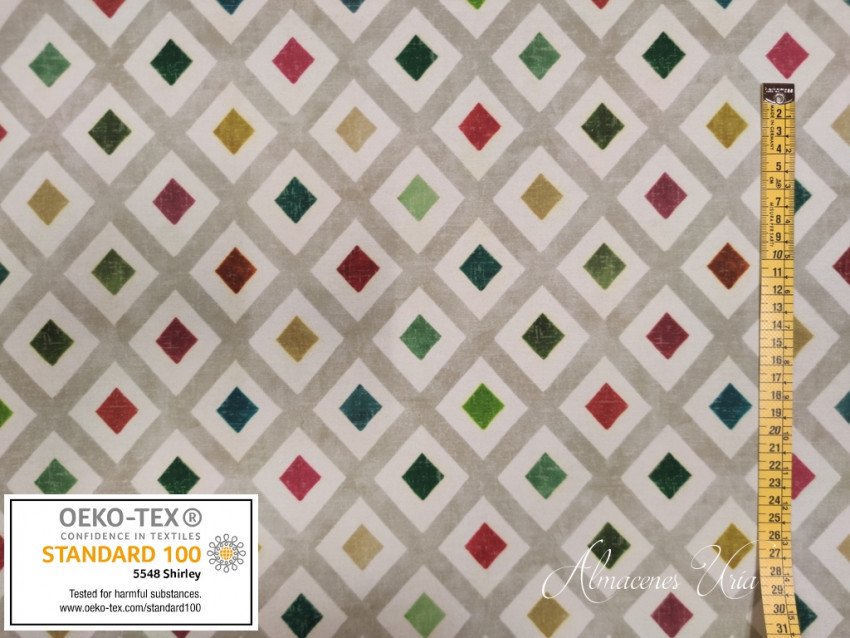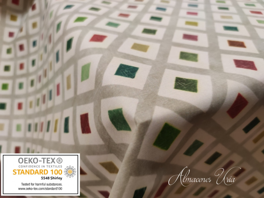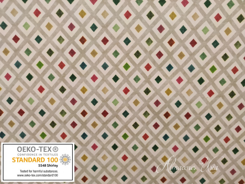 Loneta estampada con baño de teflón y acabado resinado de muy buena calidad, con cuerpo, impermeable y fácil de limpiar las manchas con un paño húmedo y jabón.