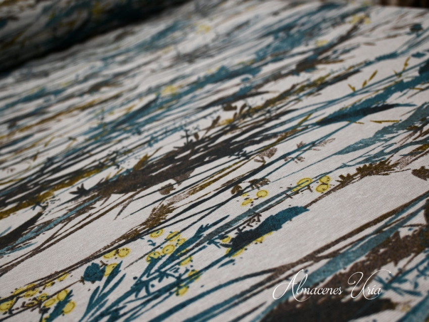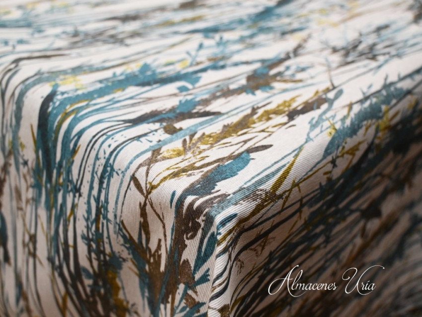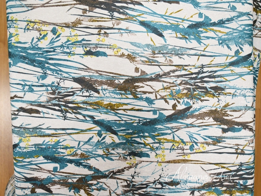 Loneta estampada con baño de teflón y acabado resinado de muy buena calidad, con cuerpo, impermeable y fácil de limpiar las manchas con un paño húmedo y jabón.