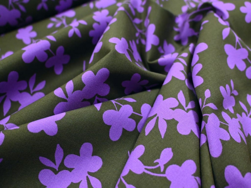 Este tejido de viscosa estampada combina suavidad, elasticidad y un estampado floral encantador en tonos lilas sobre un fondo verde oliva. Su composición de 97% viscosa y 3% elastano le confiere una caída fluida y un toque elástico que mejora la comodidad y el ajuste de las prendas confeccionadas.