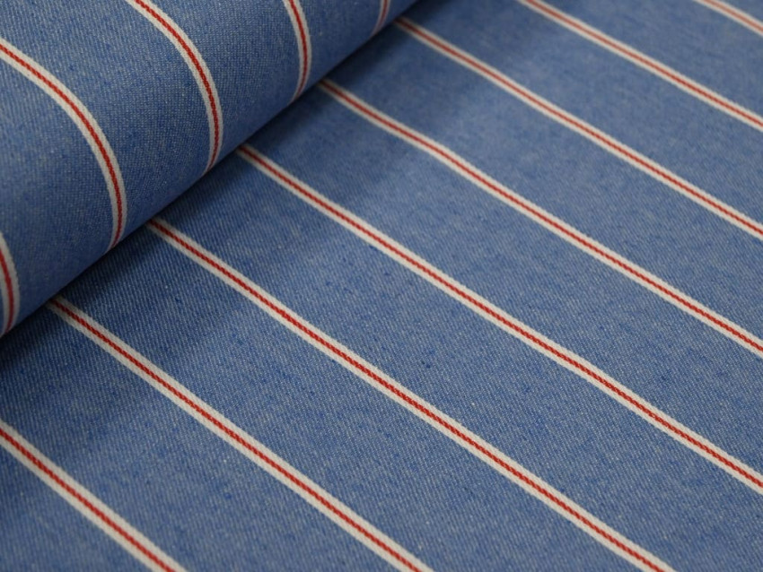 Con un ancho de 140 cm y un peso de 190 gr/m², es una opción excelente para confeccionar prendas cómodas y desenfadadas, así como para proyectos de decoración con un aire rústico o vintage. Su diseño de rayas en contraste sobre un fondo azul vaquero añade un toque dinámico y atemporal.