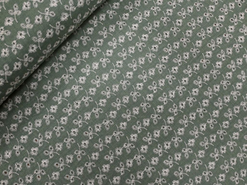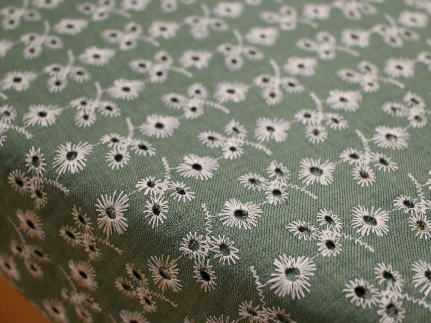 Con 140 cm de ancho y 190 gr/m², su peso lo hace ideal tanto para moda como para decoración. Su bordado floral en hilo blanco con perforaciones le añade un aire artesanal, perfecto para confecciones con un toque romántico o bohemio. Su tono verde aporta frescura y naturalidad, convirtiéndolo en una opción ideal para cualquier temporada.