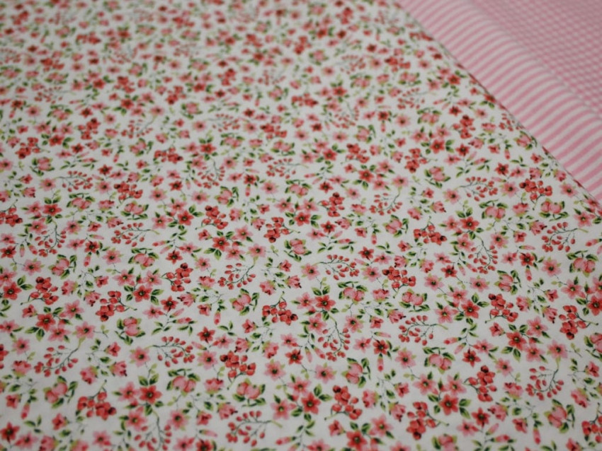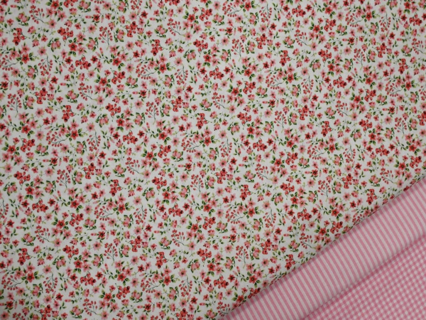 Popelín estampado 100% algodón, con un dulce diseño floral tipo Liberty en tonos rosa y verde sobre fondo blanco.