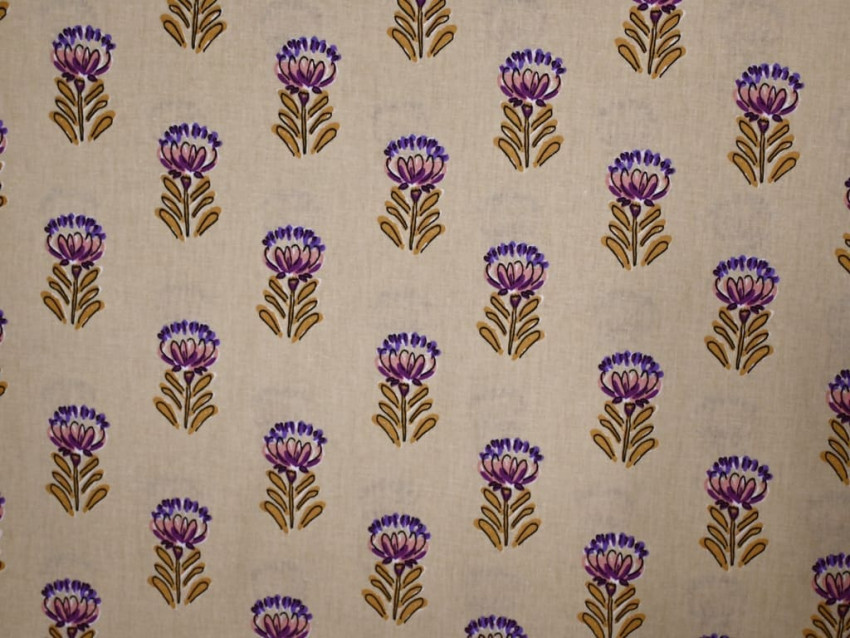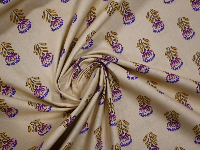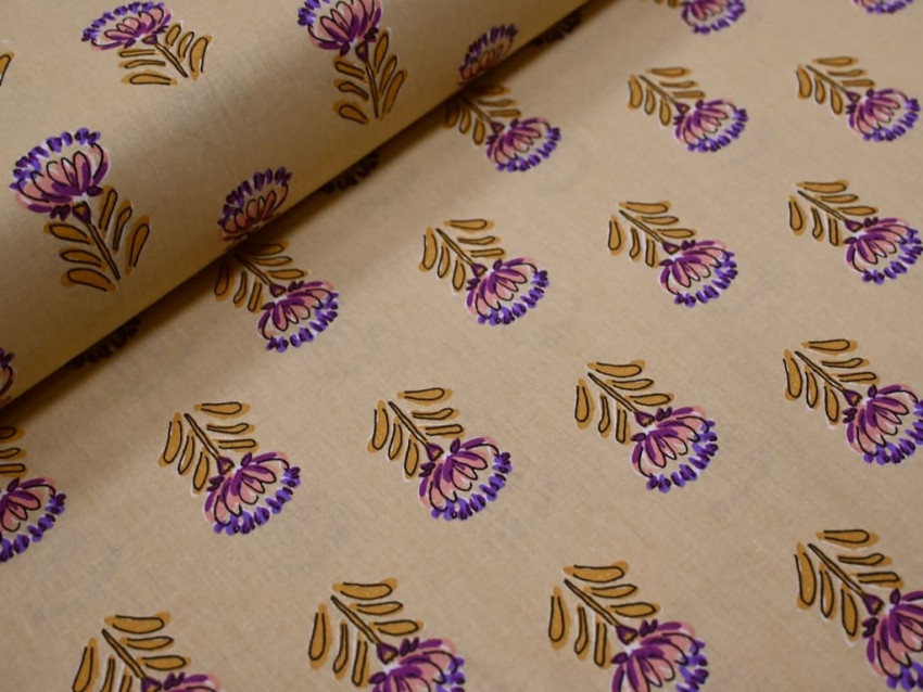 Algodón 100% natural con estampado floral en tonos malva y mostaza sobre fondo beige.