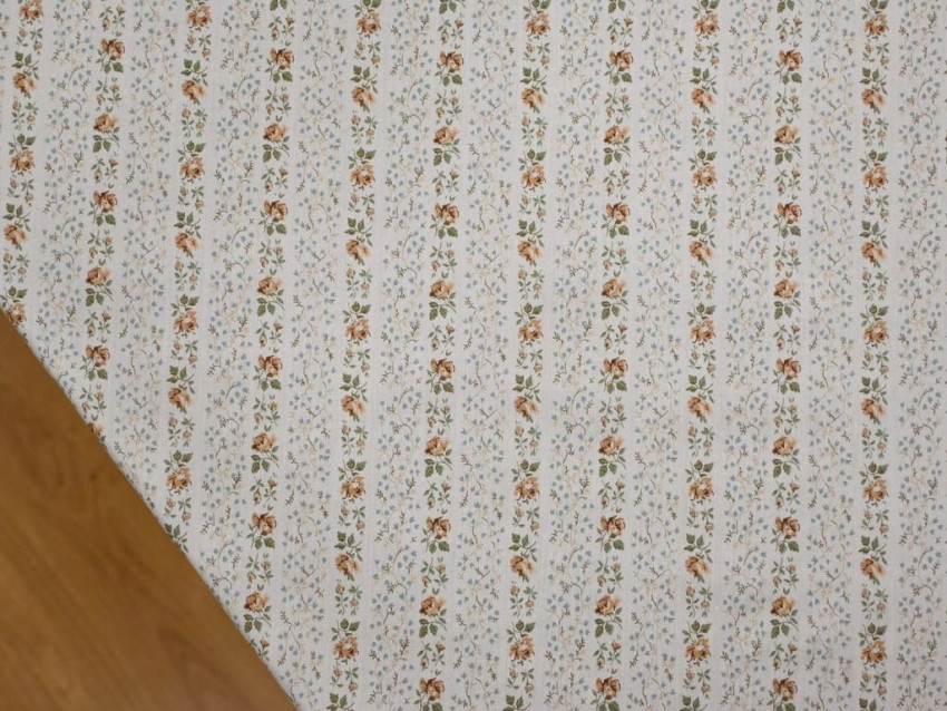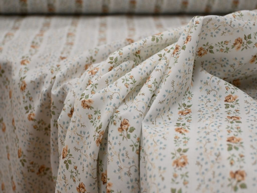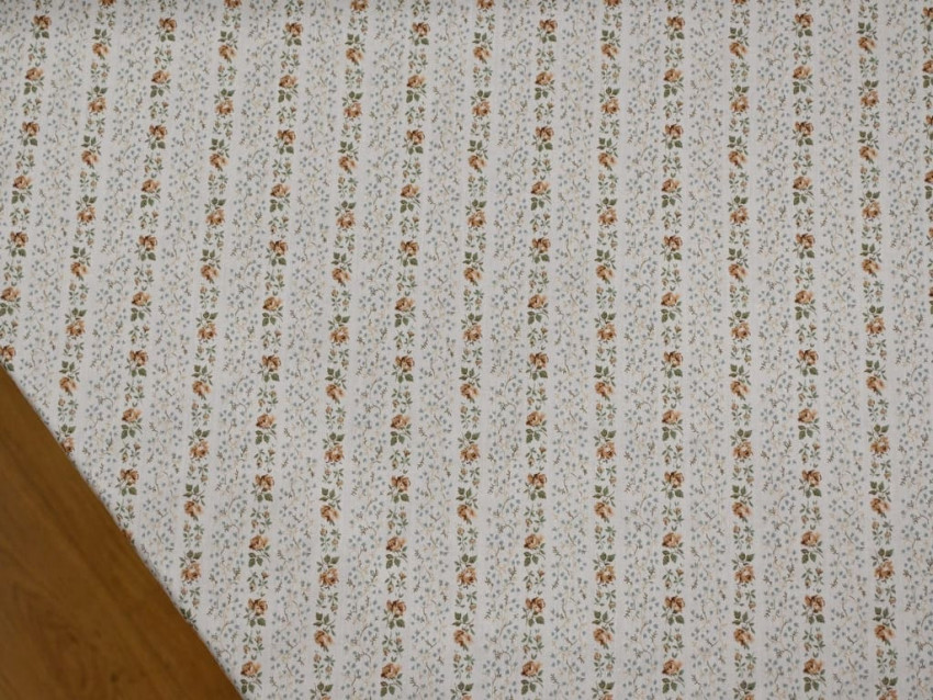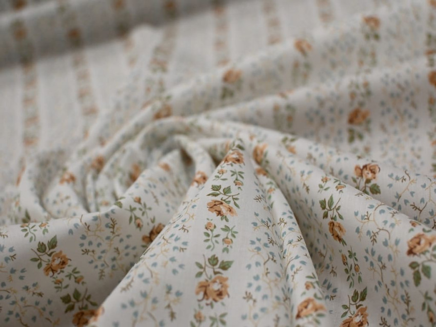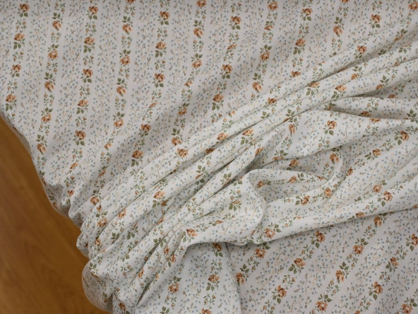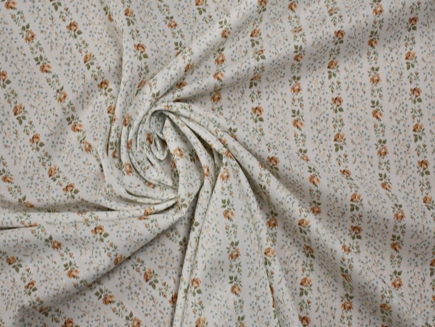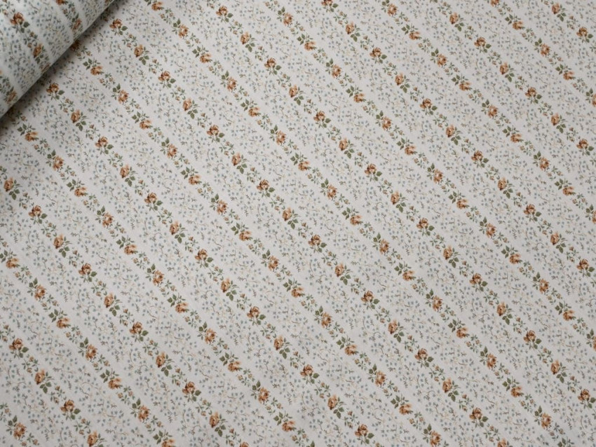 Este voile de Liberty London presenta un diseño floral en tonos tierra y verdes sobre un fondo blanco roto, dispuesto en elegantes franjas diagonales. Su composición 100% algodón y su gramaje de 65 g/m² lo convierten en un tejido excepcionalmente fino, suave y ligero, perfecto para confecciones con movimiento y delicadeza.