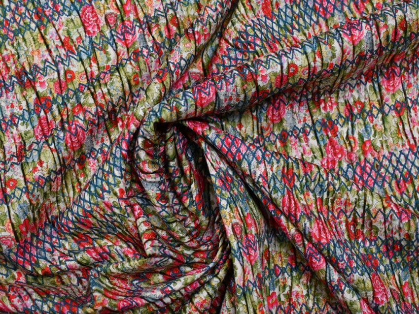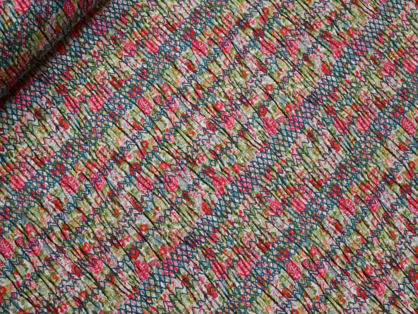 Este voile Liberty London es mucho más que un tejido floral: su diseño reproduce con precisión el efecto óptico del "smock" o fruncido tipo nido de abeja, una técnica tradicional de costura decorativa. A primera vista, parece una tela plisada o trabajada a mano, pero en realidad es un tejido plano, 100% algodón, con un estampado magistral que simula profundidad, volumen y textura real.