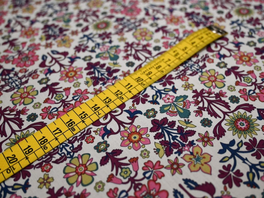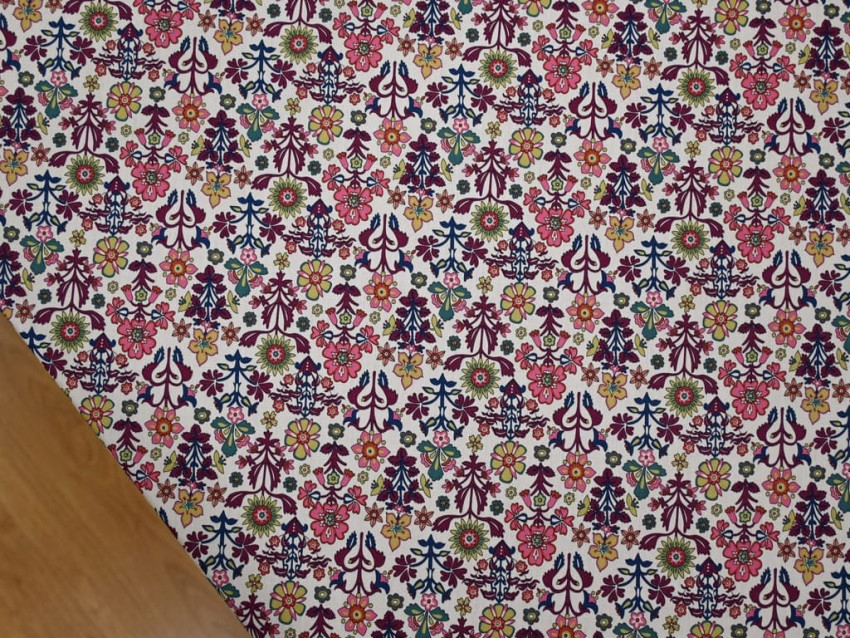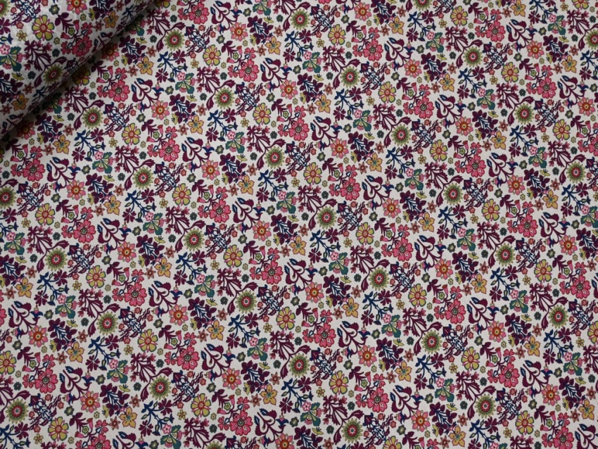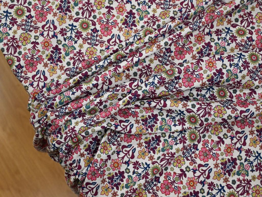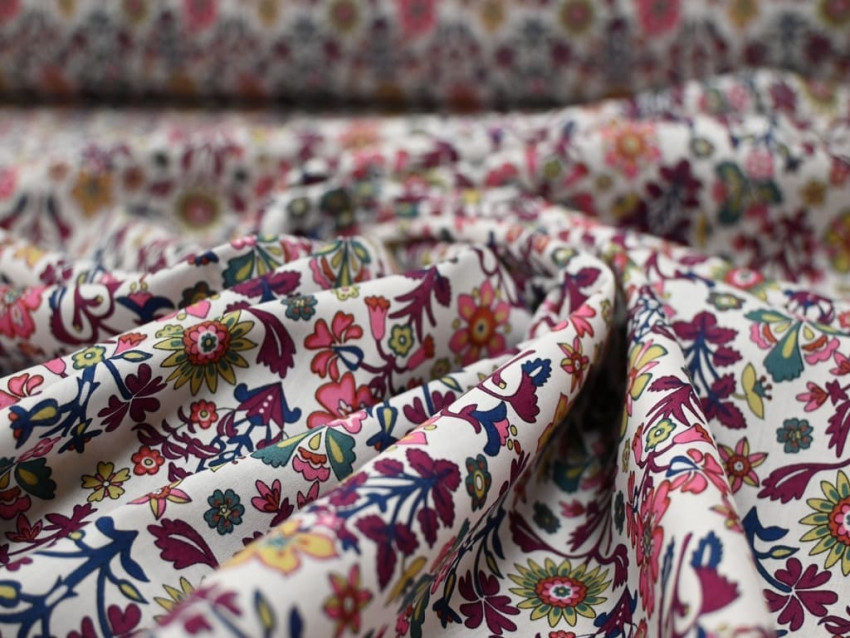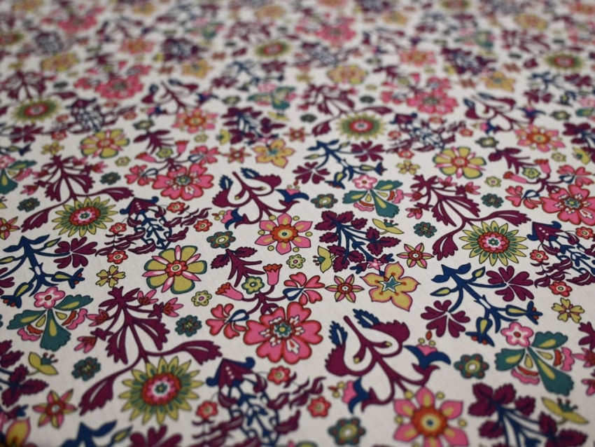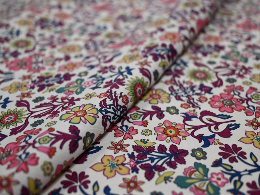 Este voile Liberty London nos transporta a la esencia más pura de la tradición floral británica. Su diseño presenta pequeñas flores y hojas en una paleta multicolor vibrante —con tonos frambuesa, mostaza, verde, azul y burdeos— sobre un fondo crudo luminoso. Un tejido plano, de algodón 100%, con tacto suave y una caída ligera y vaporosa.