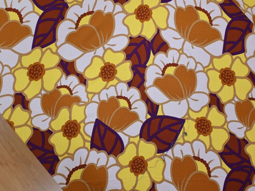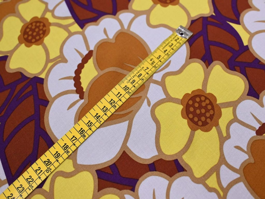 Este tejido de viscosa 100% es perfecto para quienes buscan estilo, movimiento y comodidad. Con un estampado floral XL de inspiración retro en tonos mostaza, caramelo, blanco roto y detalles púrpura, esta tela aporta personalidad y dinamismo a cualquier prenda o complemento.