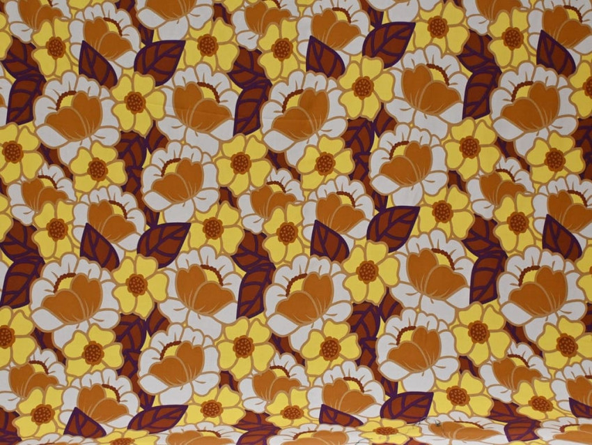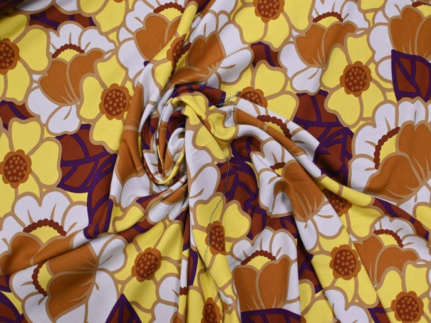 Viscosa 100% con estampado floral estilo retro en tonos cálidos.