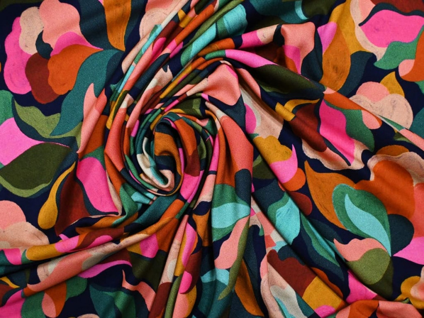 Este tejido de viscosa 100% te ofrece todo lo que buscas en una prenda fresca, cómoda y con carácter. Su estampado floral abstracto, en una paleta vibrante que combina fucsias, corales, verdes oliva, mostazas y turquesas sobre un fondo azul marino intenso, transmite energía y elegancia en partes iguales.