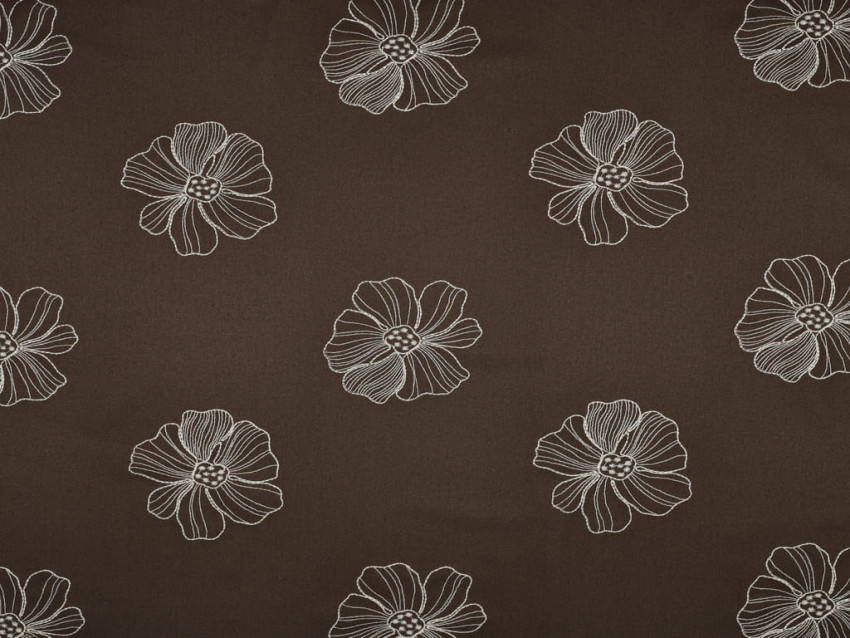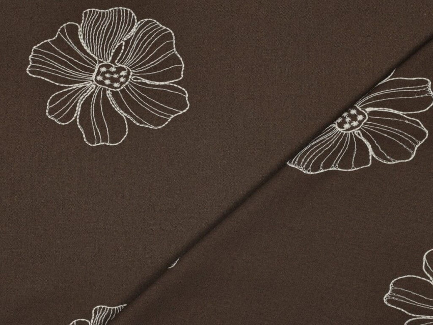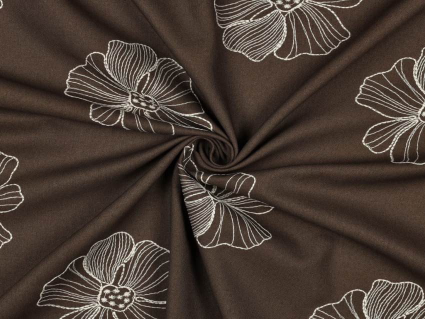Lino bordado de alta calidad con flores en relieve sobre fondo marrón. Mezcla de lino y viscosa que aporta frescura, suavidad y una caída elegante. Ideal para prendas naturales y sofisticadas.