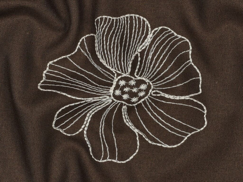 El bordado floral en hilo claro genera un contraste elegante sobre base marrón, aportando textura visual y un acabado artesanal muy valorado en confección de calidad.