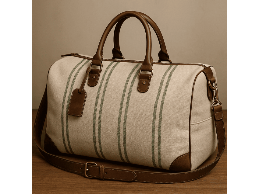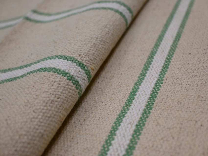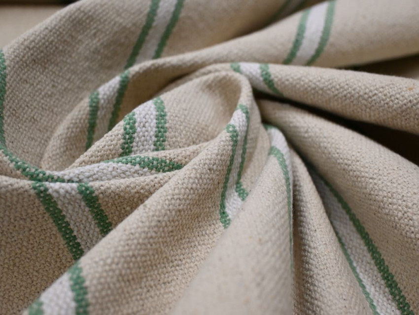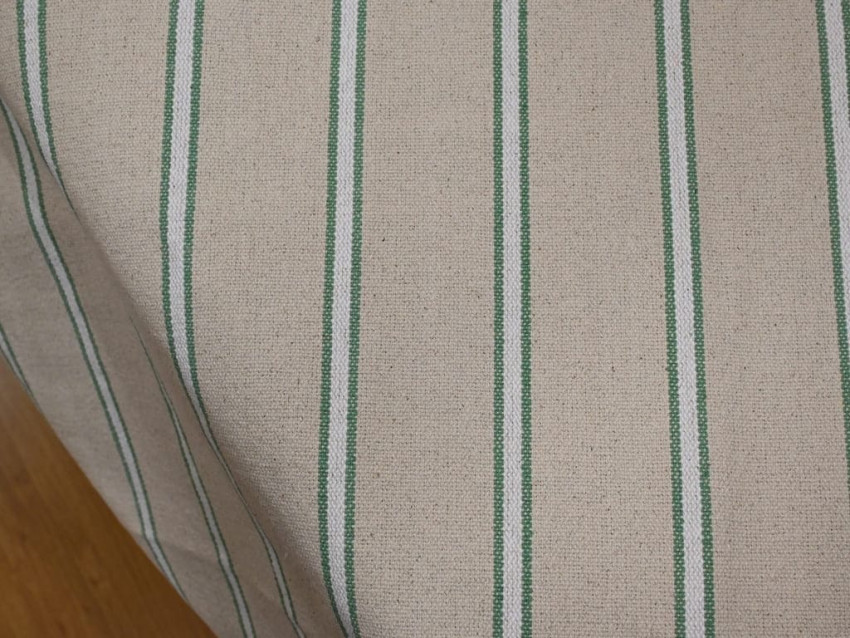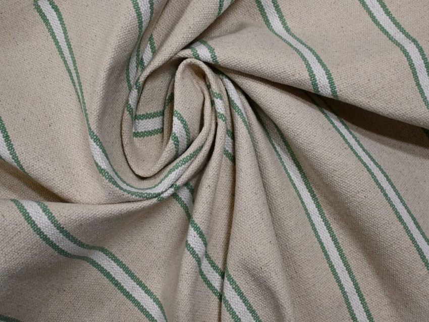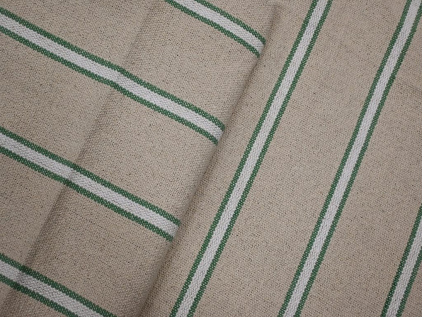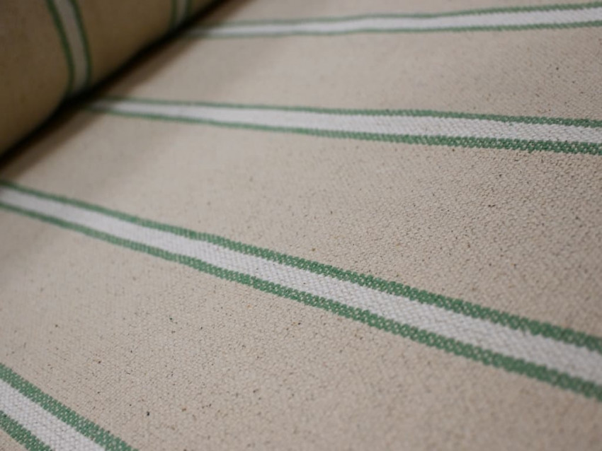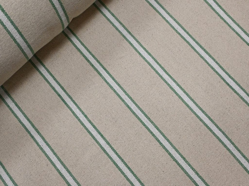 Loneta rústica 100 % algodón, 600 g/m², con elegantes rayas dobles verde + blanco cada ~6,5 cm sobre fondo natural. Ancho 140 cm.