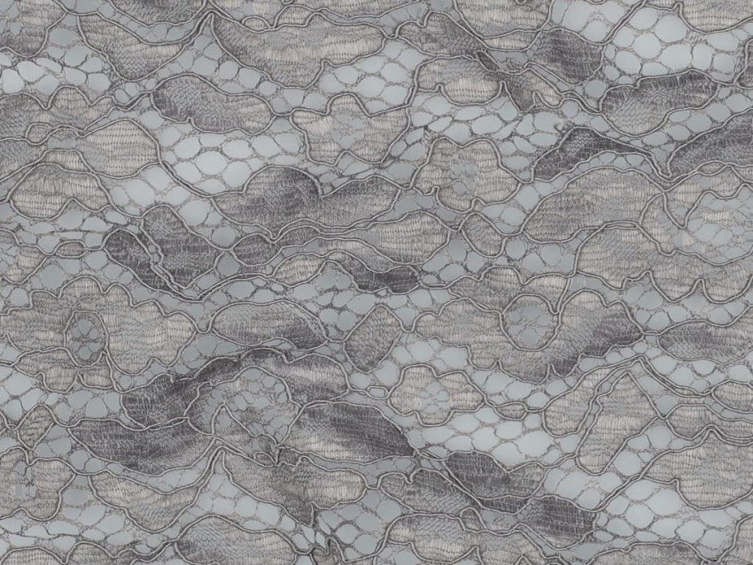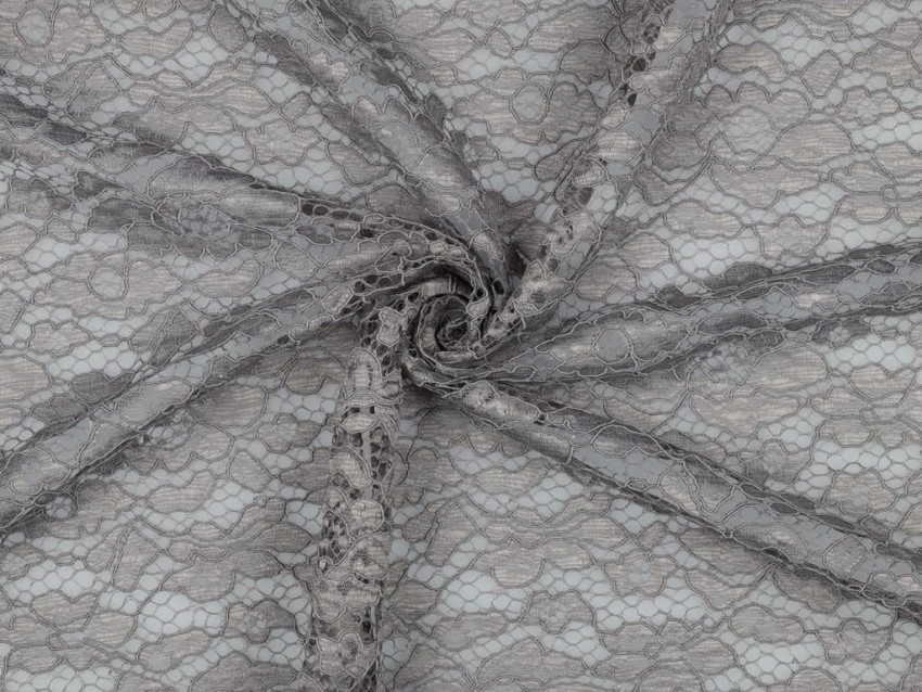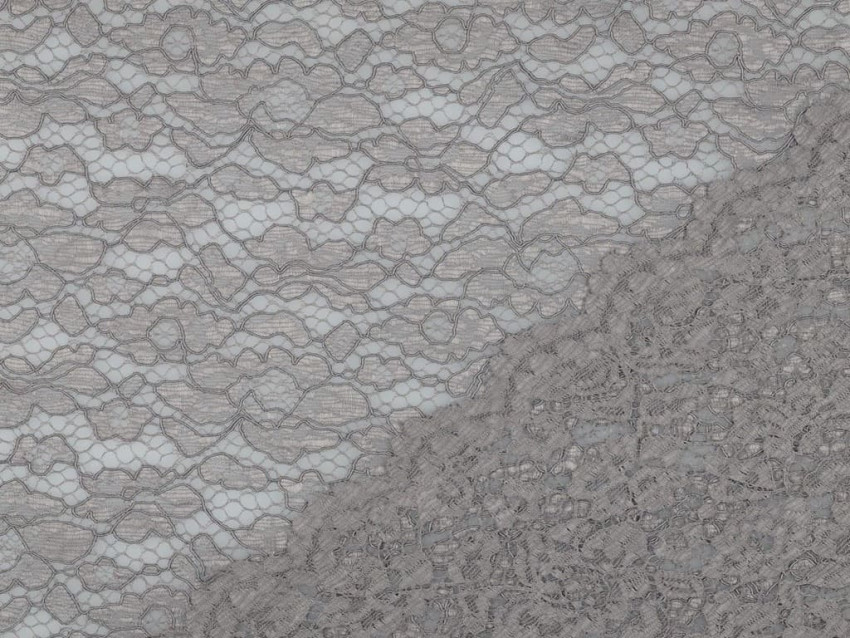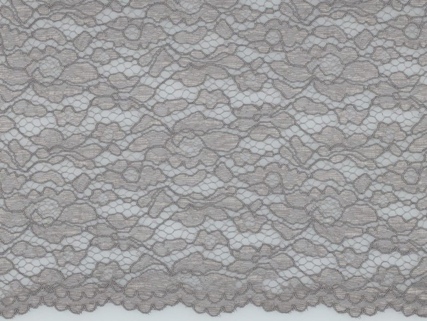 Encaje gris de poliéster con doble orillo festoneado y dibujo continuo. Ligero, flexible y decorativo, ideal para prendas y detalles donde se busca un acabado elegante y equilibrado sin exceso de protagonismo.