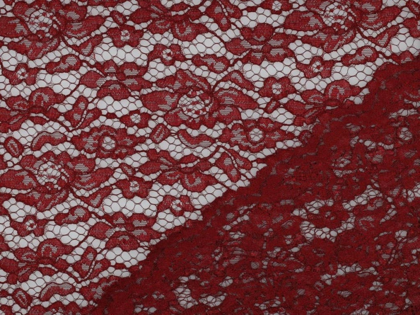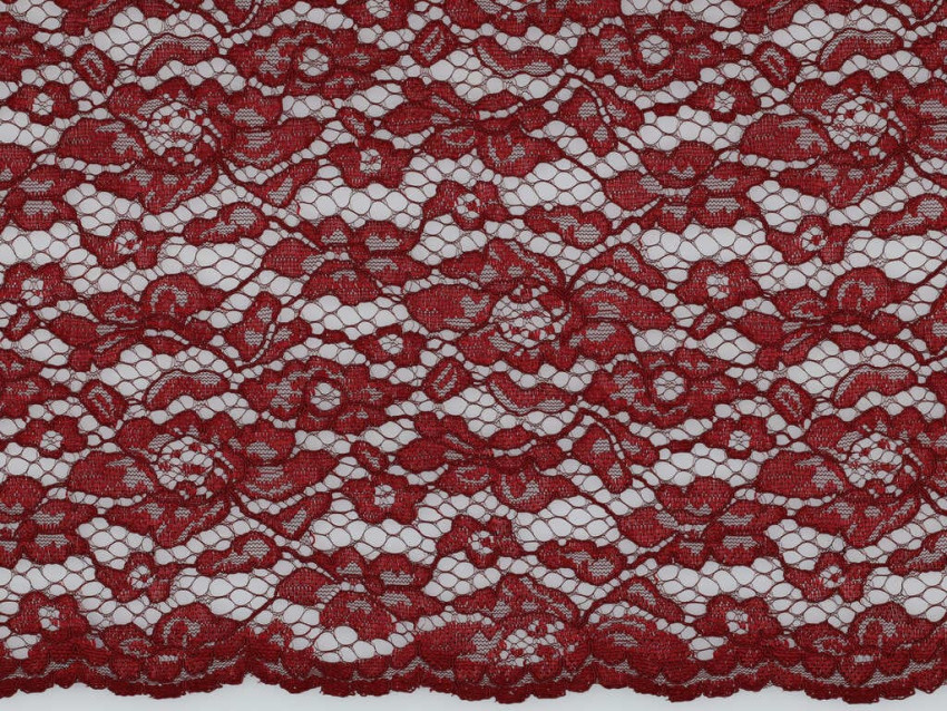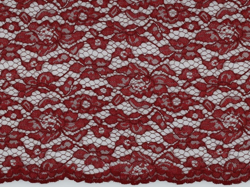 Encaje granate de poliéster con doble orillo festoneado y dibujo continuo. Un tejido ligero y decorativo que aporta profundidad y elegancia a las prendas, ideal para diseños cuidados donde el color marca la diferencia.