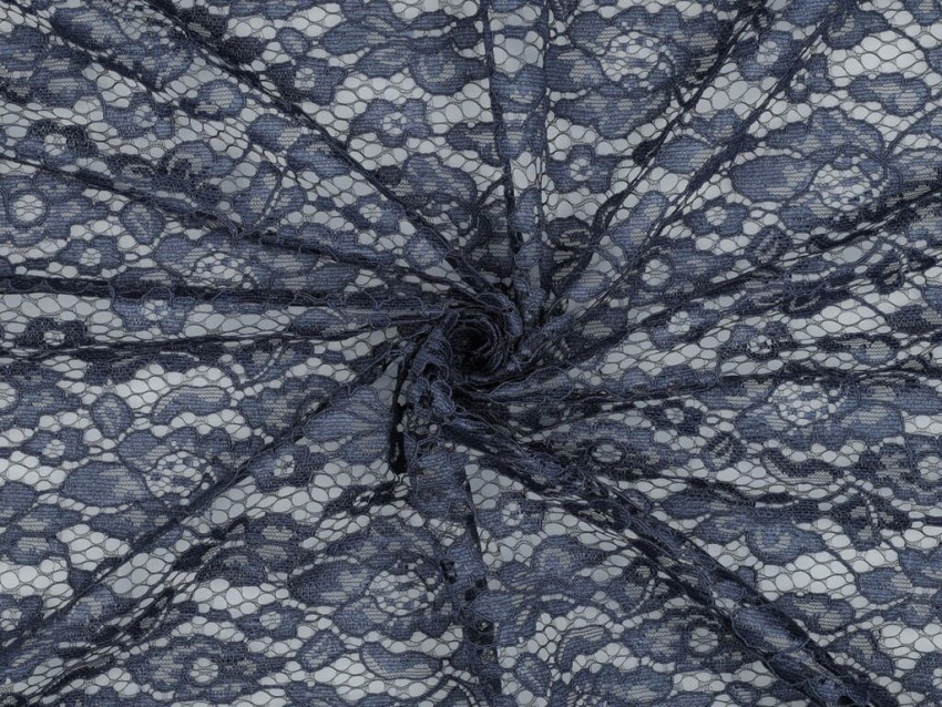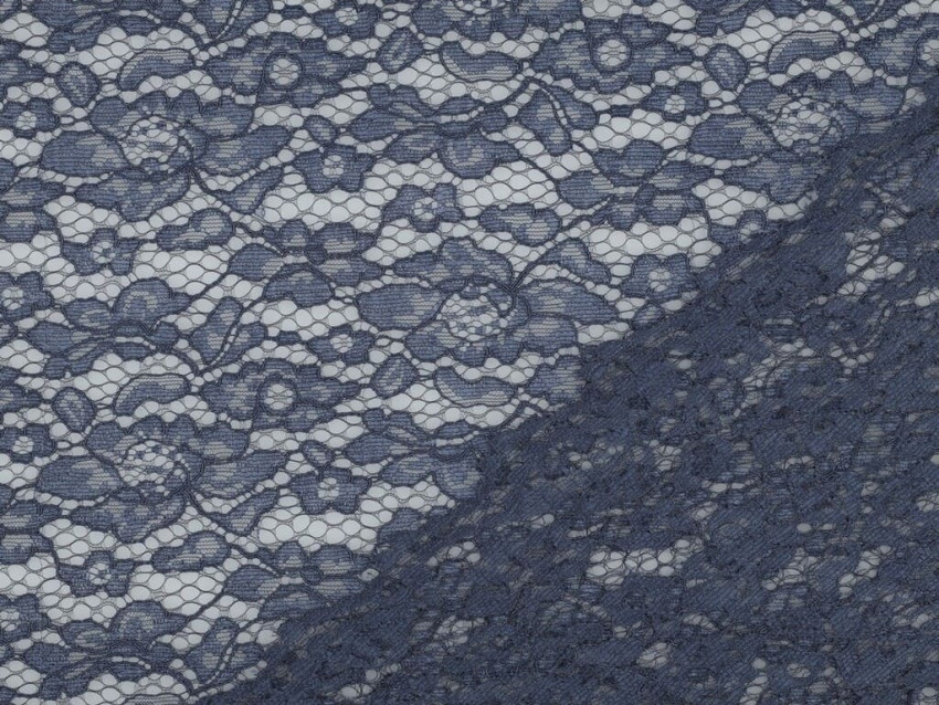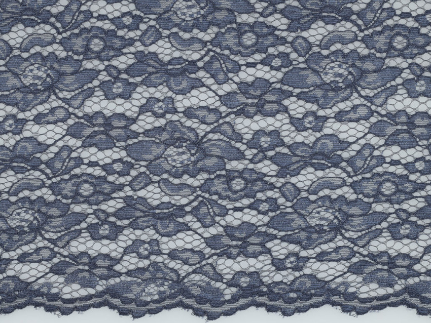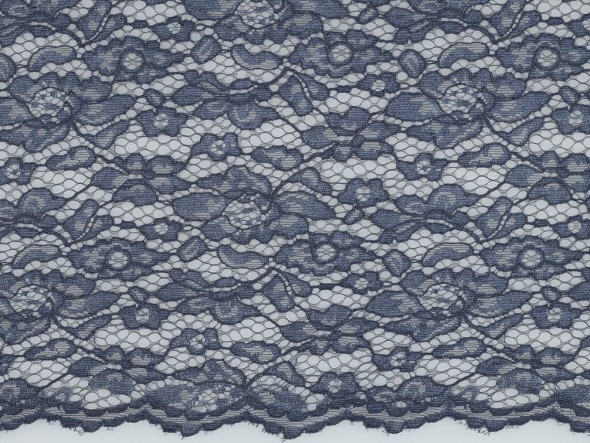 Este encaje en color azul vaquero está confeccionado en poliéster 100%, con un ancho de 130 cm y un gramaje de 140 g/m². Incorpora doble orillo festoneado, pensado para aprovechar el borde directamente como acabado decorativo en la prenda.