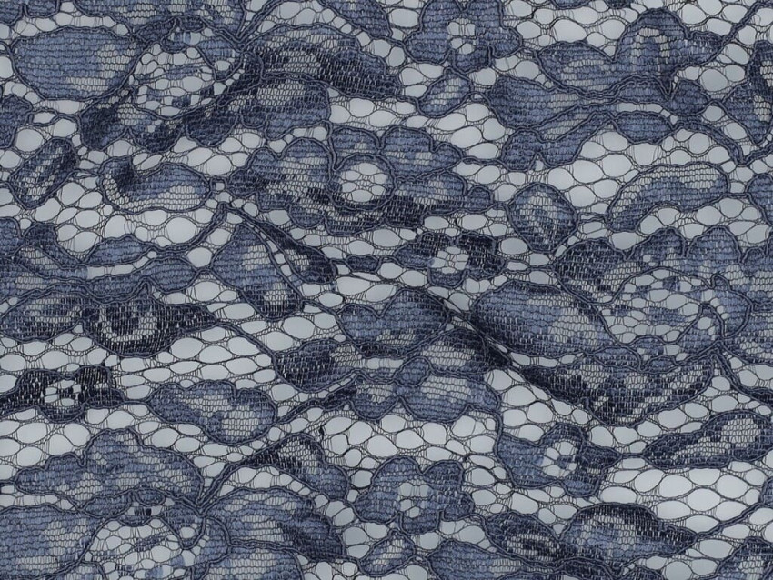 Encaje azul vaquero de poliéster con doble orillo festoneado y dibujo continuo. Ligero y decorativo, ideal para aportar un toque actual y equilibrado a prendas con carácter informal-elegante.
