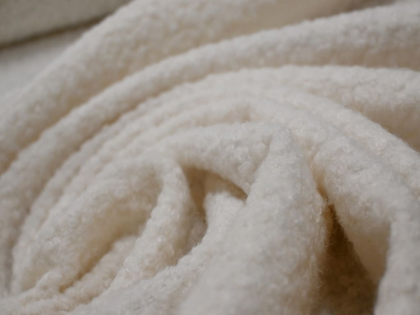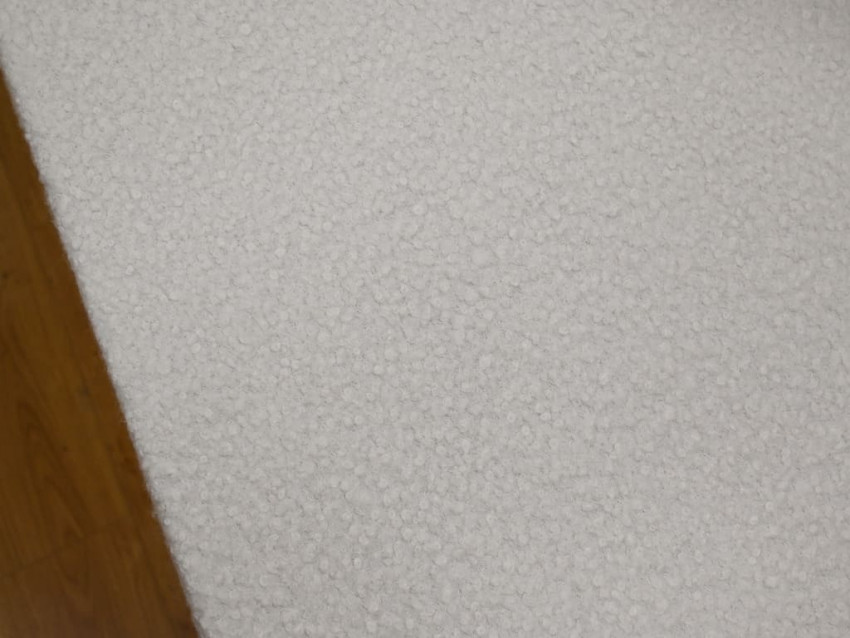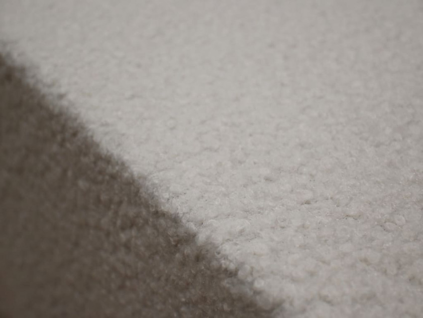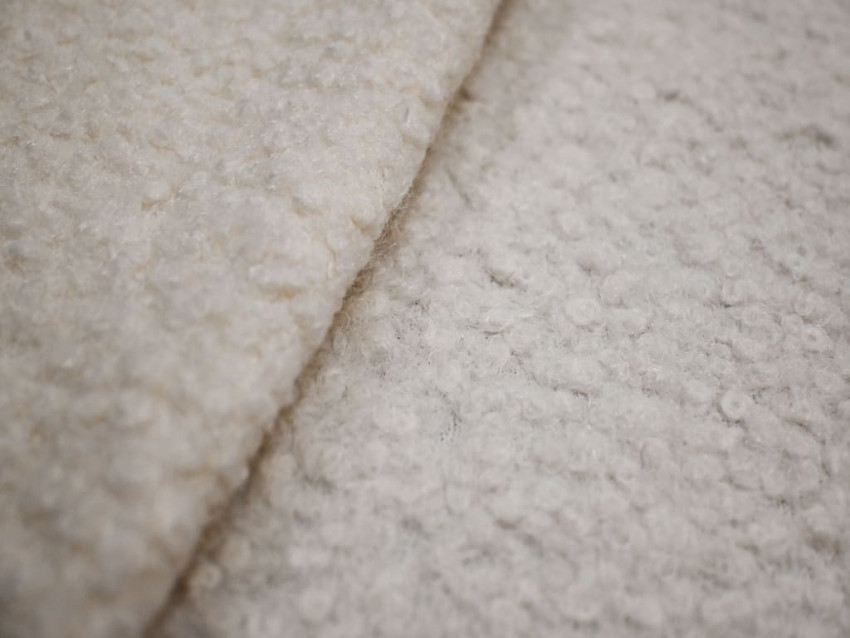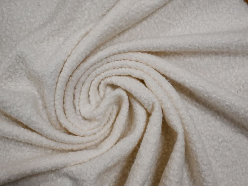 Elegante bouclé blanco roto de 150 cm de ancho y 310 g/m², 100 % poliéster. Su textura rizada aporta volumen y calidez, ideal para confección de abrigo, chaquetas de estilo Chanel y prendas de temporada con caída estructurada y acabado exclusivo.