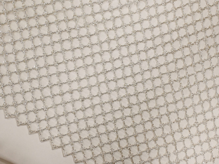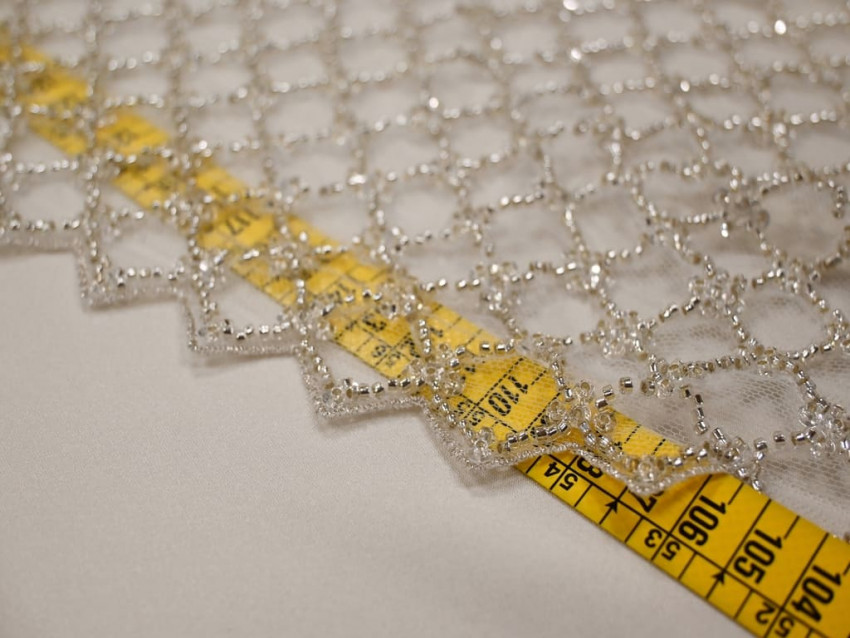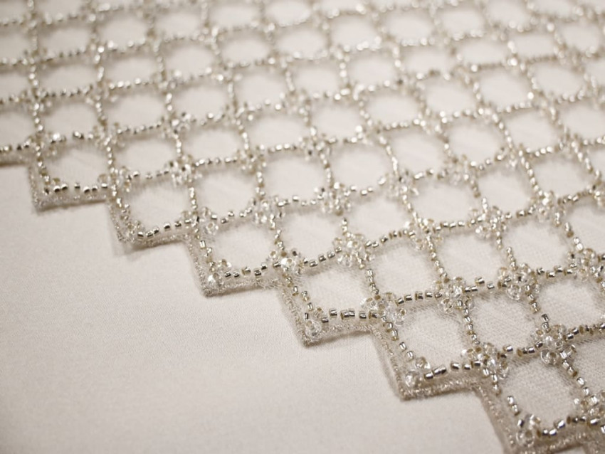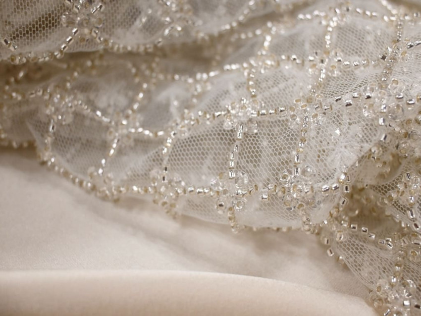 Exclusivo tul con pedrería de 135 cm de ancho, ideal para confeccionar vestidos de novia y gala.