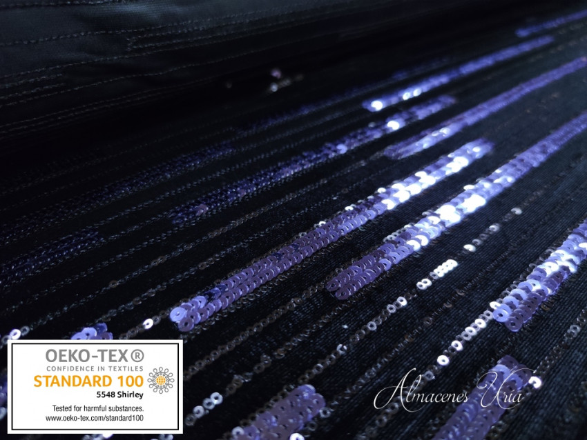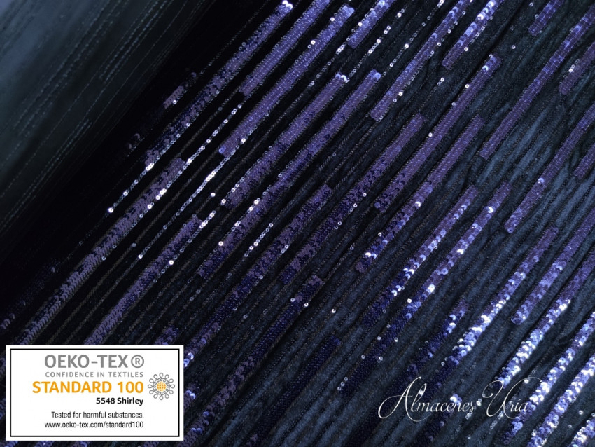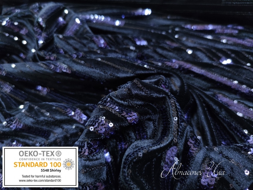 Terciopelo negro con paillete azul marino.