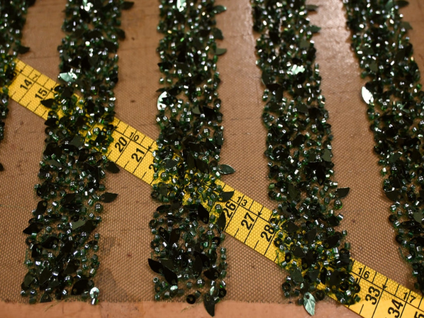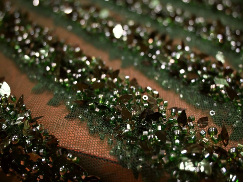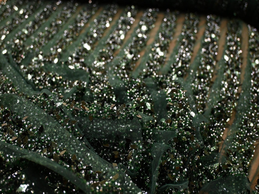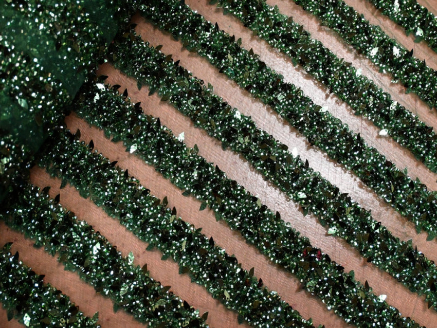 Exclusivo tejido de pedrería sobre base de tul, con 130 cm de ancho y un impresionante peso de 800 gr/ml.
