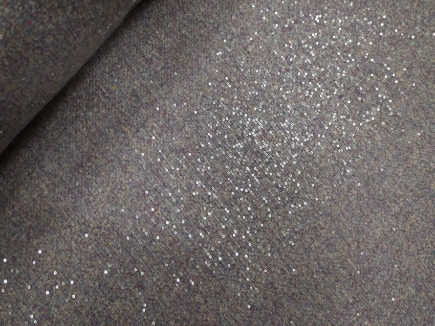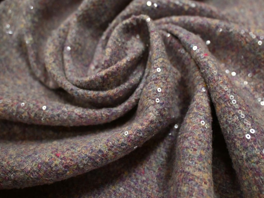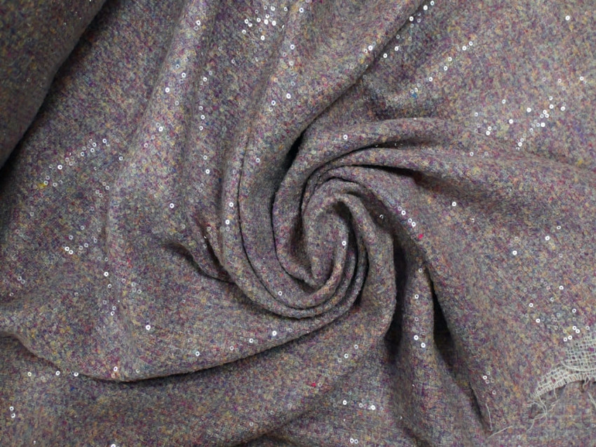 El tweed con lentejuelas es una fusión perfecta entre la tradición y el glamour. Su base de tweed, un tejido de gran presencia y estructura, se realza con la aplicación de lentejuelas brillantes, aportando un toque de distinción sin perder su esencia clásica.
