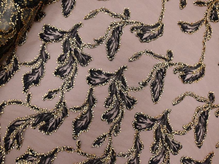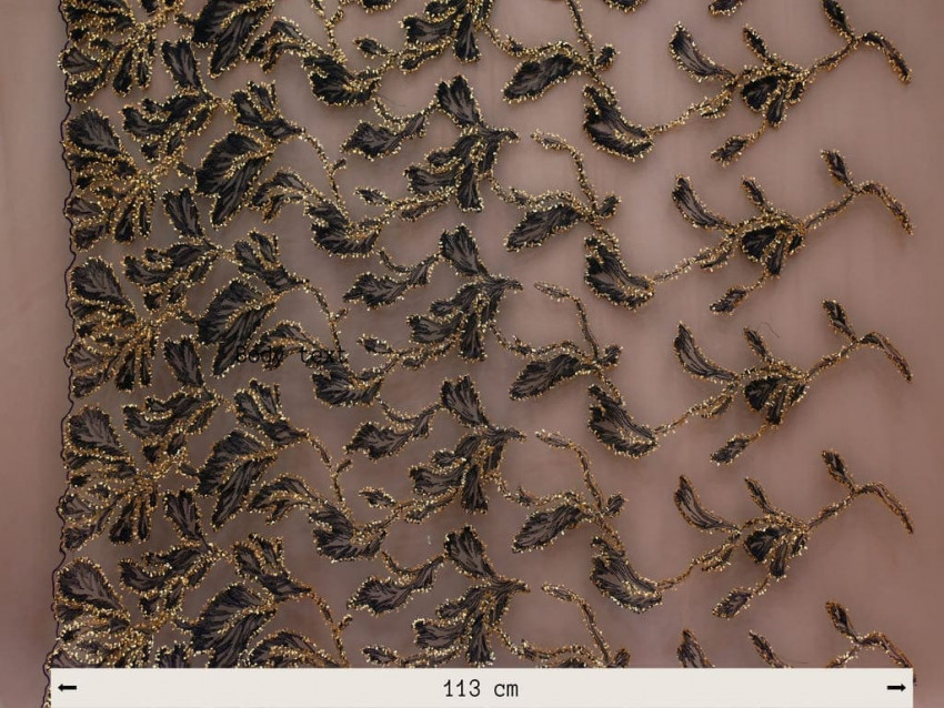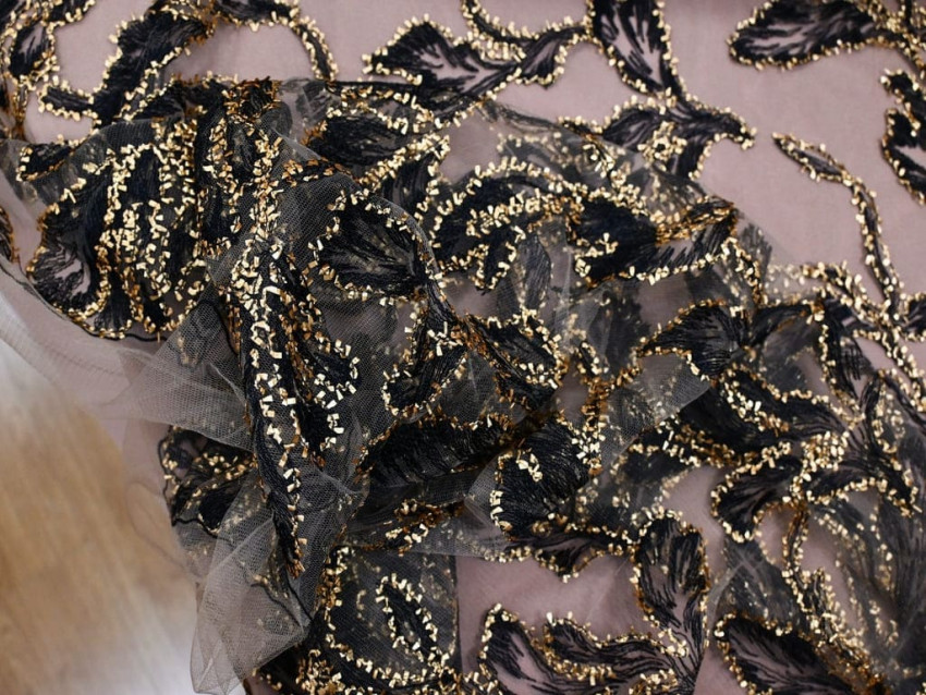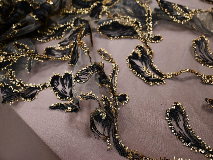 Descubre la esencia del lujo con este tul bordado de alta costura, donde el arte y la elegancia se entrelazan en un diseño excepcional. Su base translúcida sirve de lienzo para un majestuoso bordado floral en negro, perfilado con bordados en hilo dorado que aportan brillo y sofisticación.