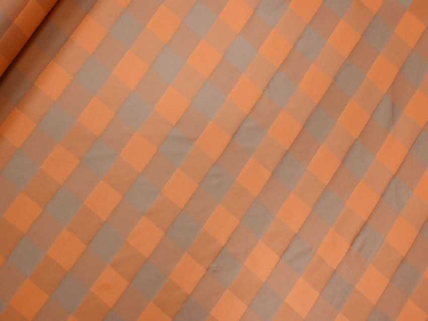 Exclusivo tafetán 100% poliéster de 150 cm de ancho, con un espectacular estampado de cuadros grandes en tonos tierra y naranja.