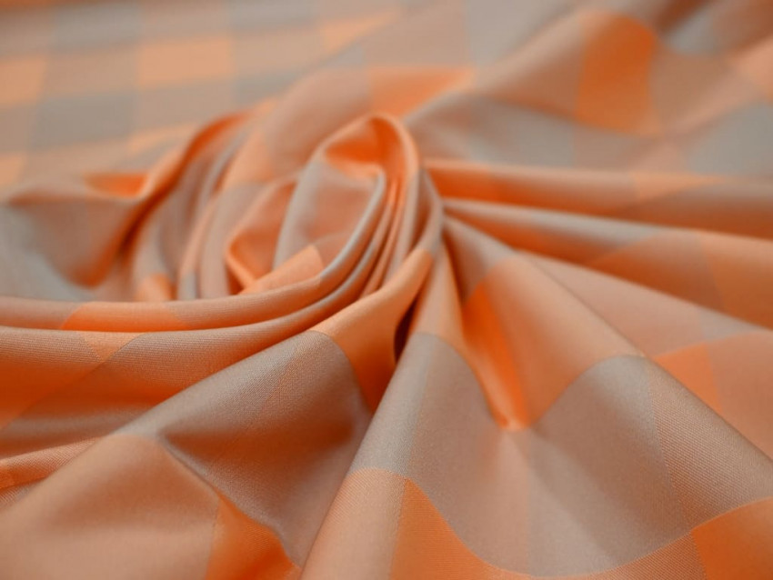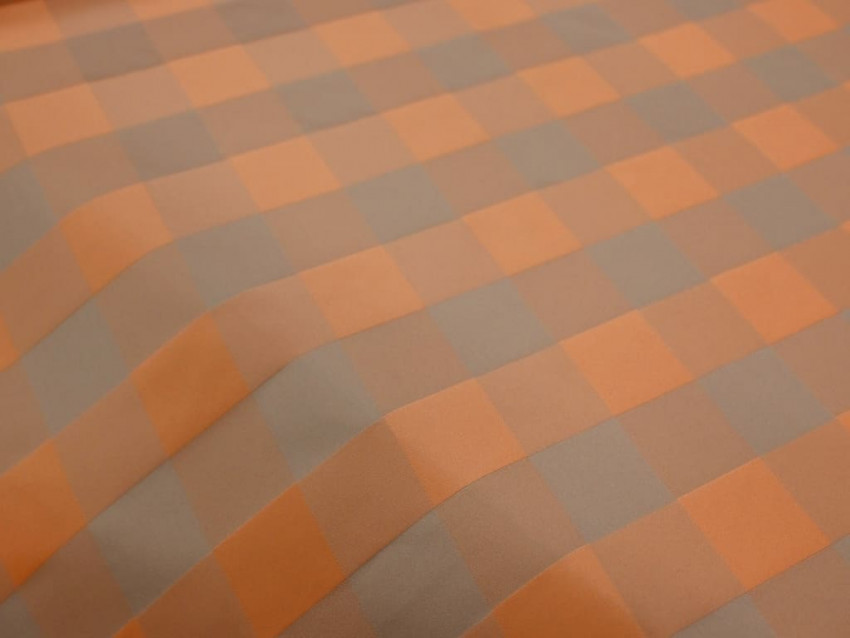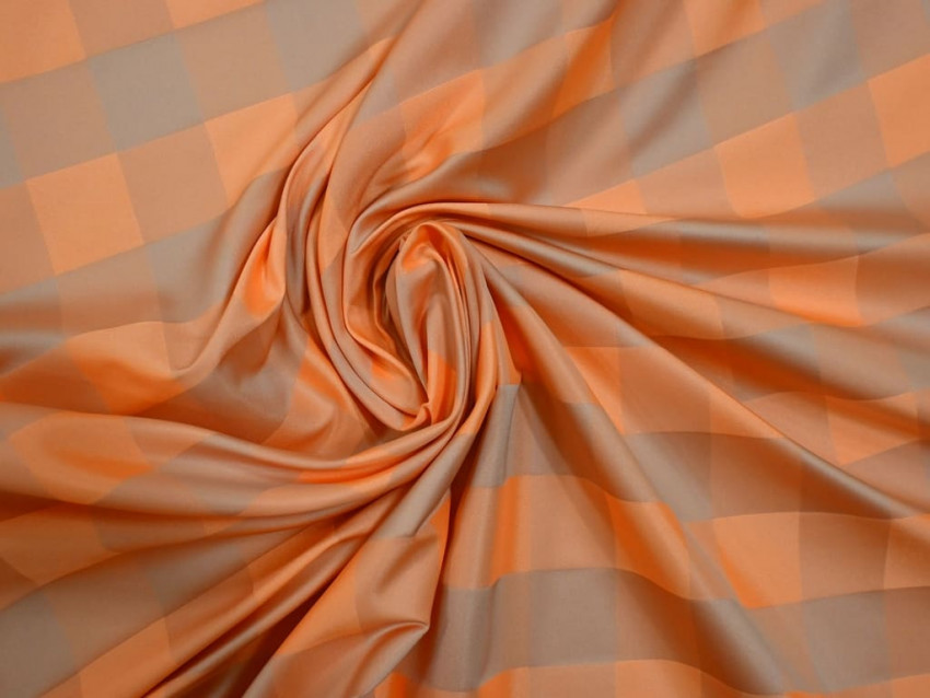 Este tafetán estampado de poliéster 100% es mucho más que un tejido. Su diseño de cuadros grandes en tonos naranja y beige aporta un estilo sofisticado y contemporáneo, perfecto para creaciones que buscan destacar.