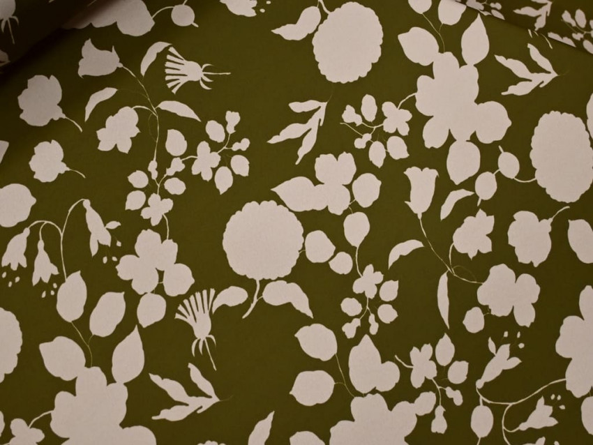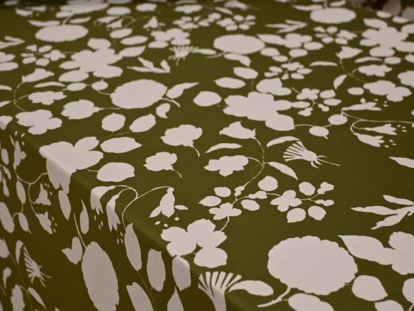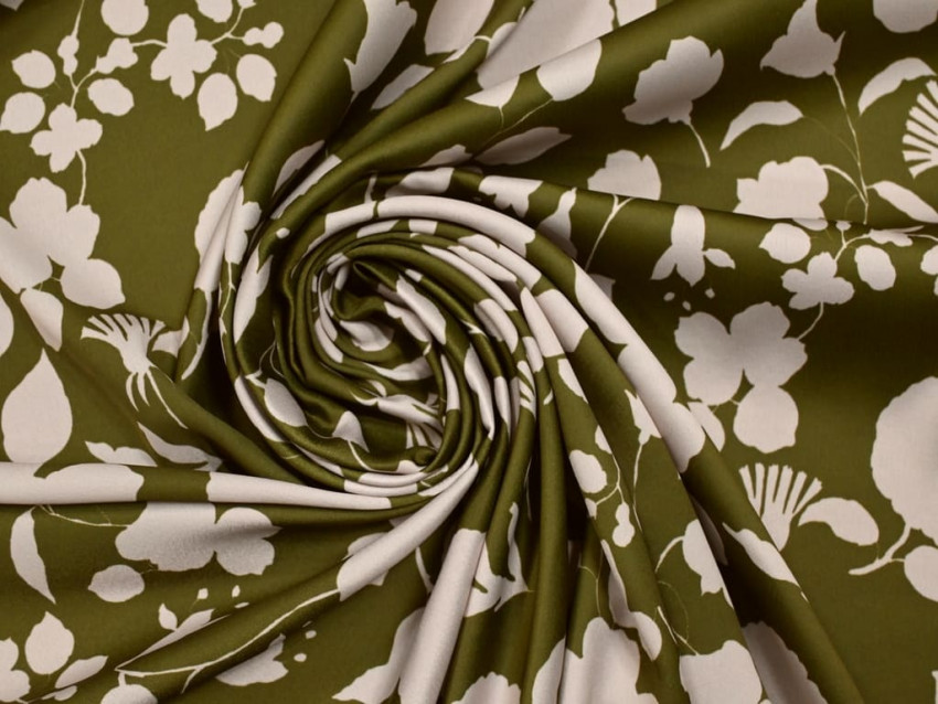El estampado floral en blanco sobre fondo verde oliva ofrece una estética limpia, serena y muy versátil. Es ideal para quienes buscan tejidos cómodos, con caída y fáciles de trabajar.
