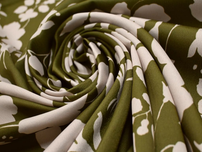 Crepé de poliéster con 6% elastano, estampado floral en blanco sobre fondo verde oliva. Ligero, con caída fluida y un toque de elasticidad. Ideal para prendas cómodas y con movimiento.