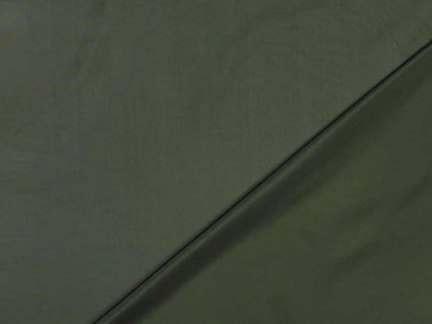 Tela impermeable en verde oscuro, 100% poliéster, muy fina y ultraligera (70 g/m²). Ideal para capas, forros, fundas y accesorios que requieren protección frente al agua sin añadir peso. Caída fluida y acabado técnico brillo y mate