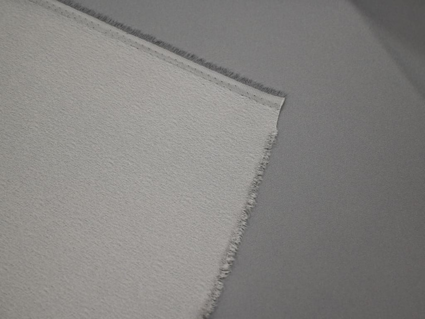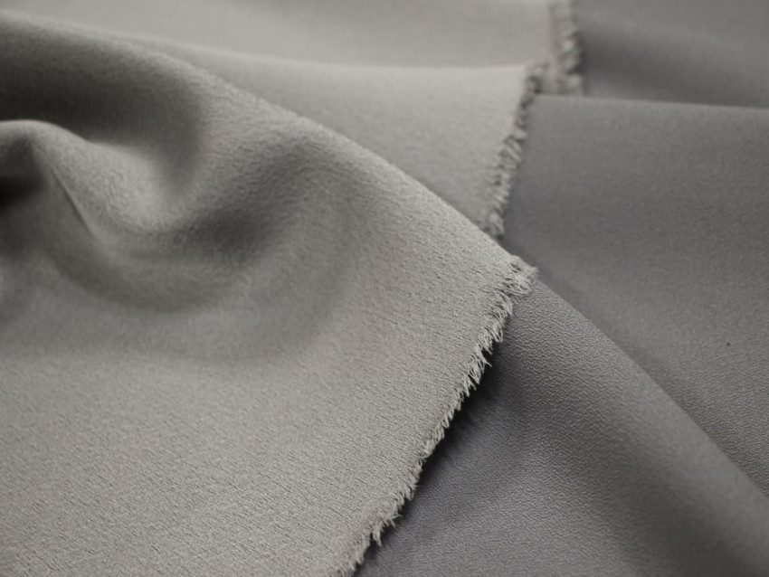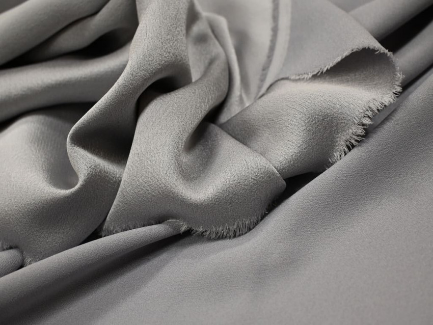 Crepé de raso gris perla con sutil brillo satinado y caída estructurada.