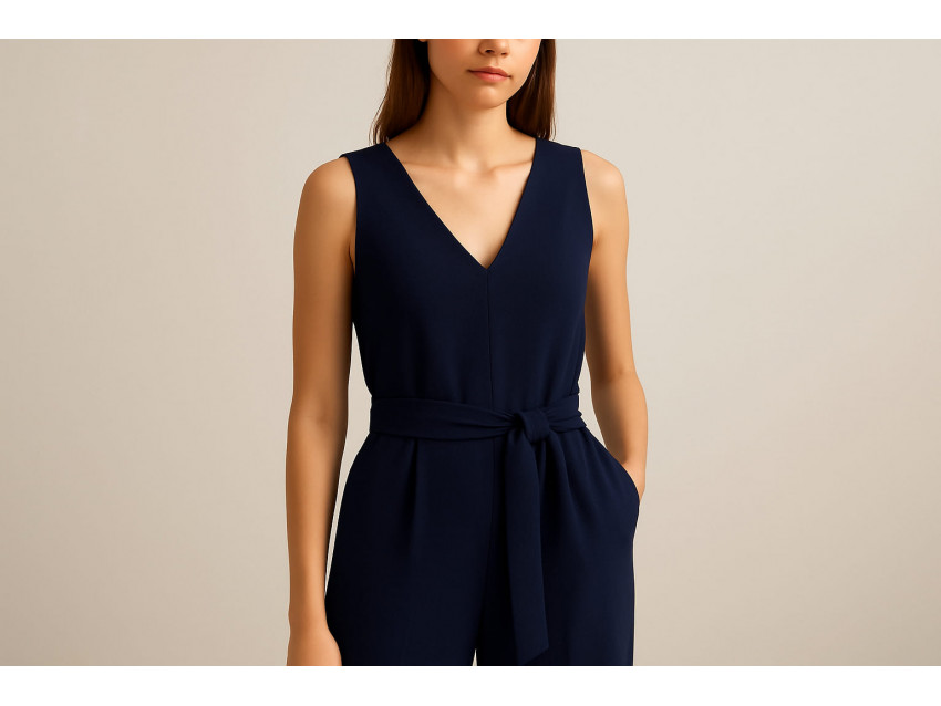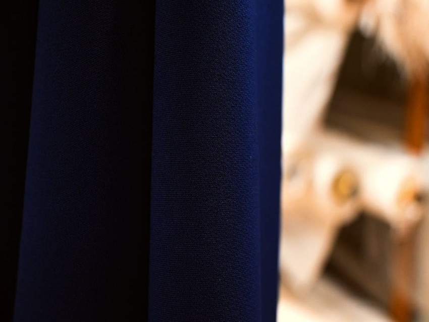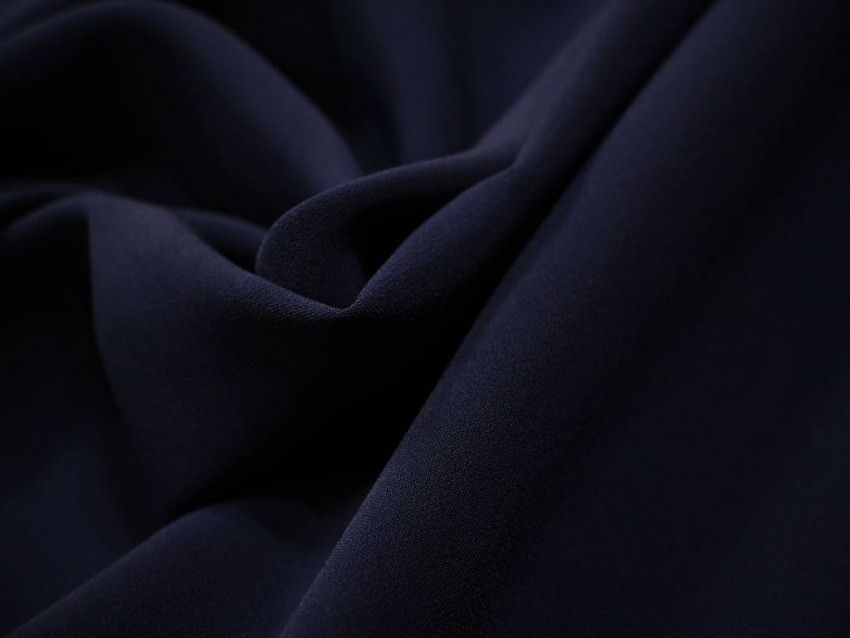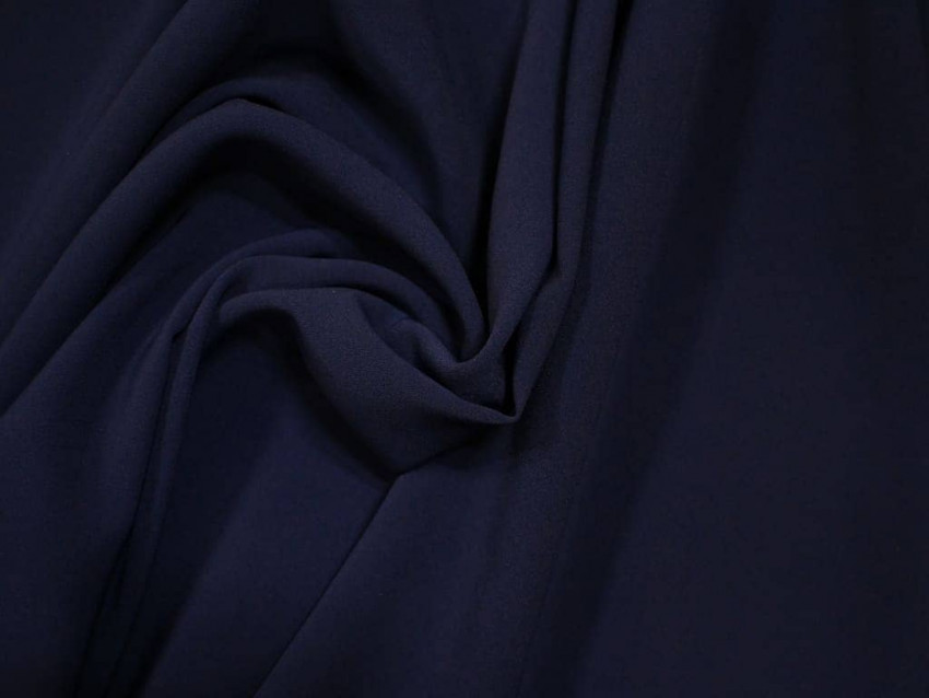 Doble crêpe azul medianoche (378 g/ml, 140 cm) con caída media y tacto firme. Ideal para monos chic, trajes sastre y vestidos de noche; opaco y anti-arrugas.