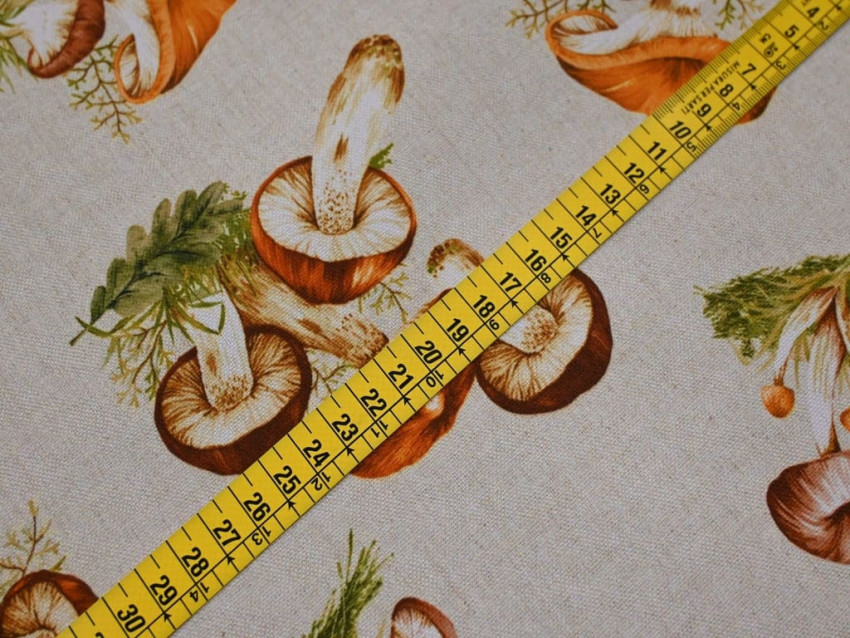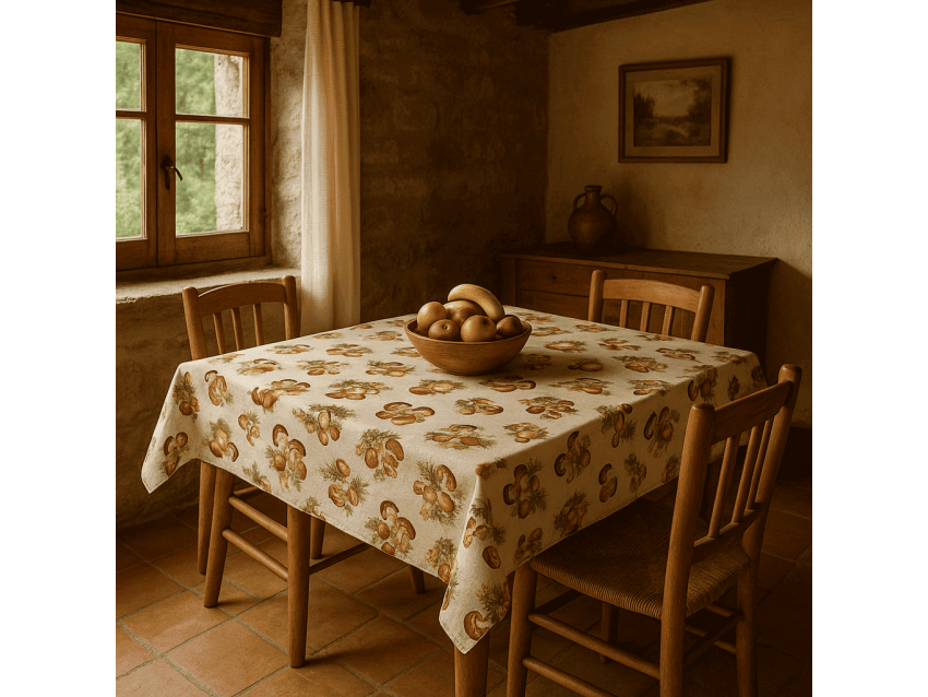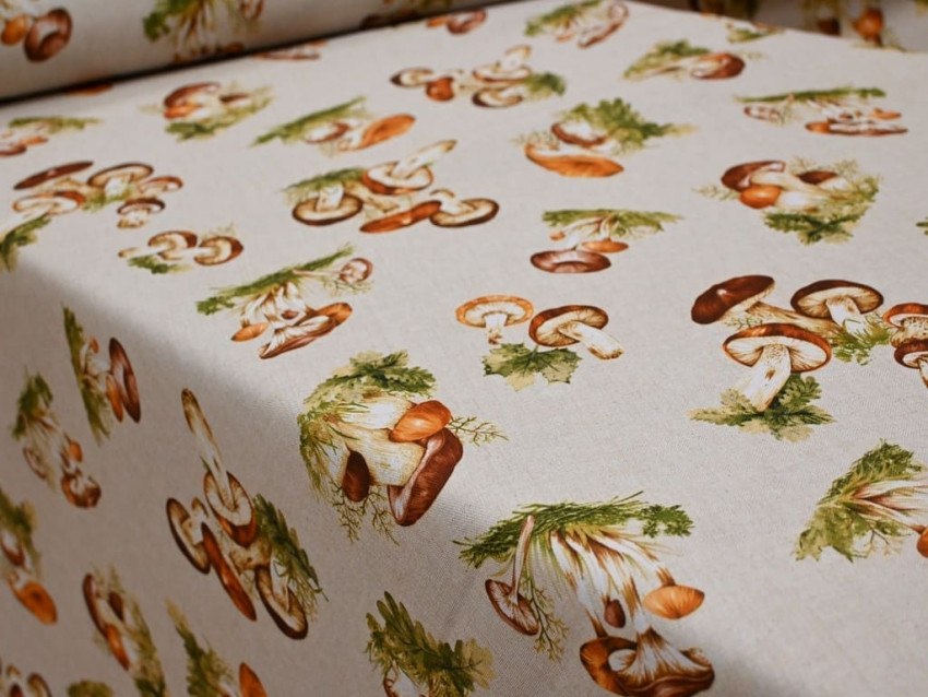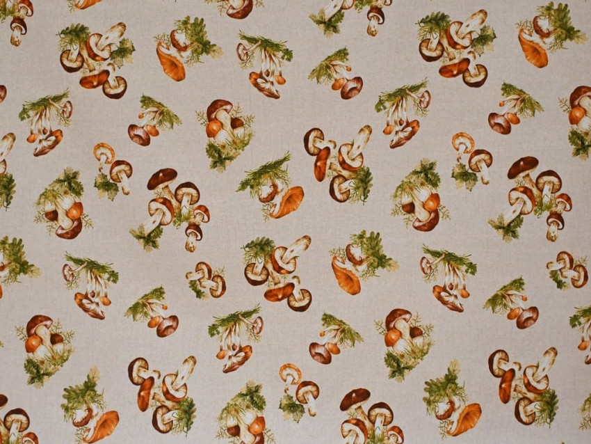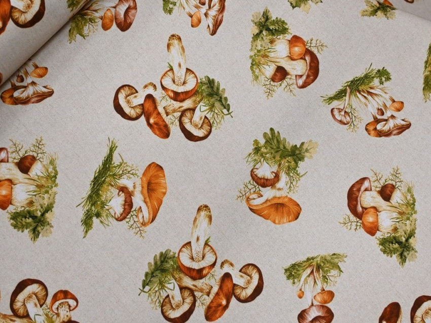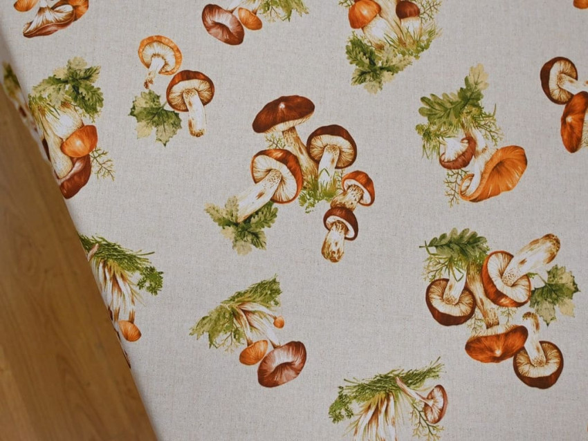 Loneta 100% poliéster con estampado de setas silvestres, ideal para mantelería y decoración con un aire rústico y natural. Ancho 160 cm y gramaje de 235 g/m². Resistente, fácil de coser y de gran calidad.