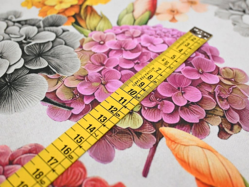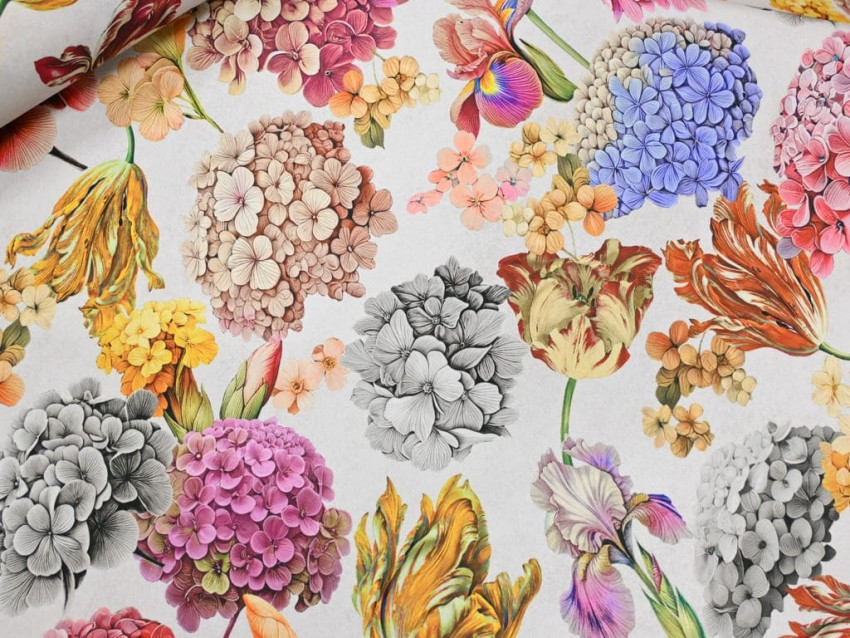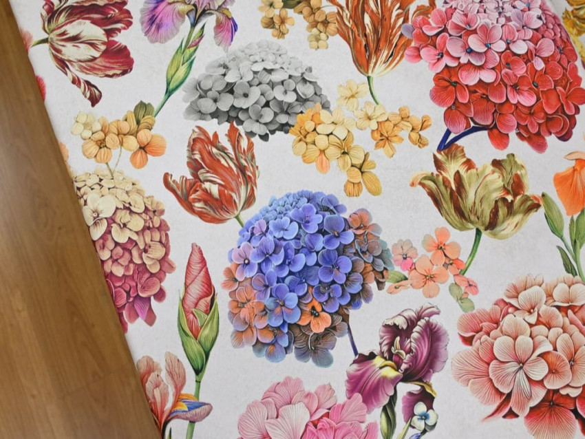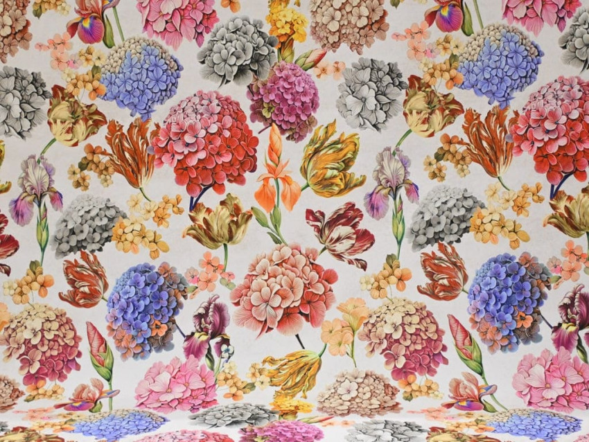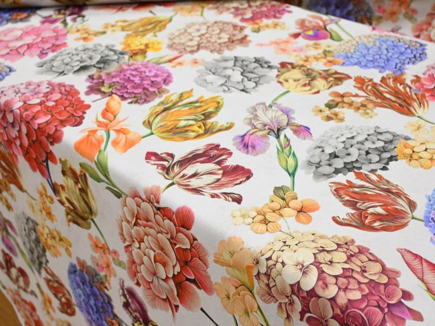 Loneta decorativa con un colorido estampado de flores variadas como hortensias, tulipanes, narcisos, lirios e hibiscos, sobre un fondo blanco roto que realza aún más los tonos vibrantes. Fabricada en 100% poliéster, tiene un ancho de 160 cm y un gramaje de 235 g/m², lo que la convierte en una opción resistente, fácil de trabajar y visualmente llamativa.