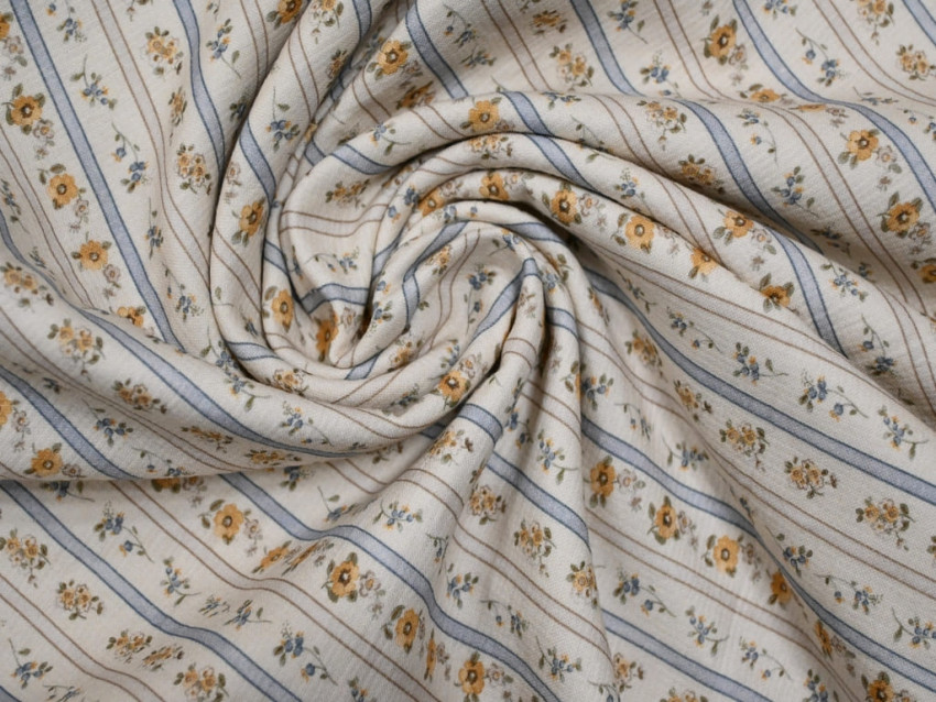 Algodón rústico 100 % a rayas con mini flores ocre & azul. 165 g/m², 140 cm de ancho. Consistencia media, look campestre-vintage para moda y hogar.