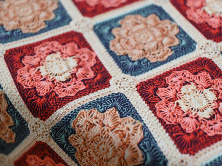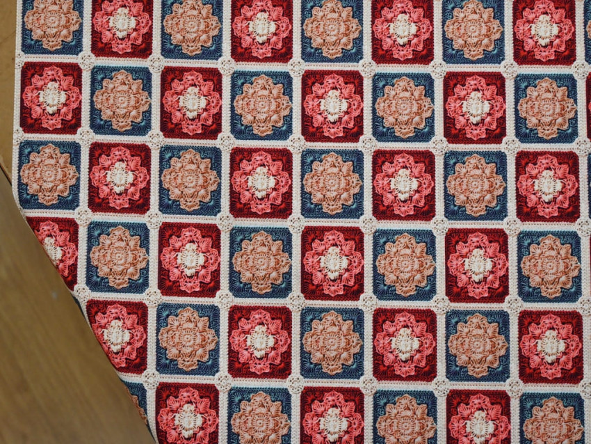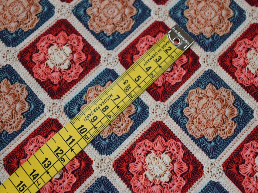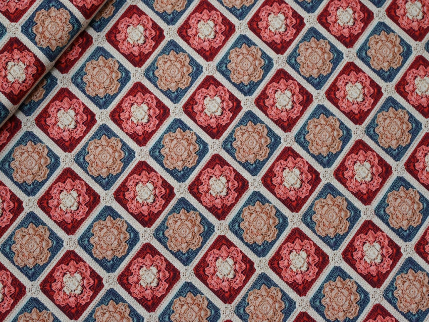 Popelín 100% algodón con original estampado que simula cuadros de crochet a color.