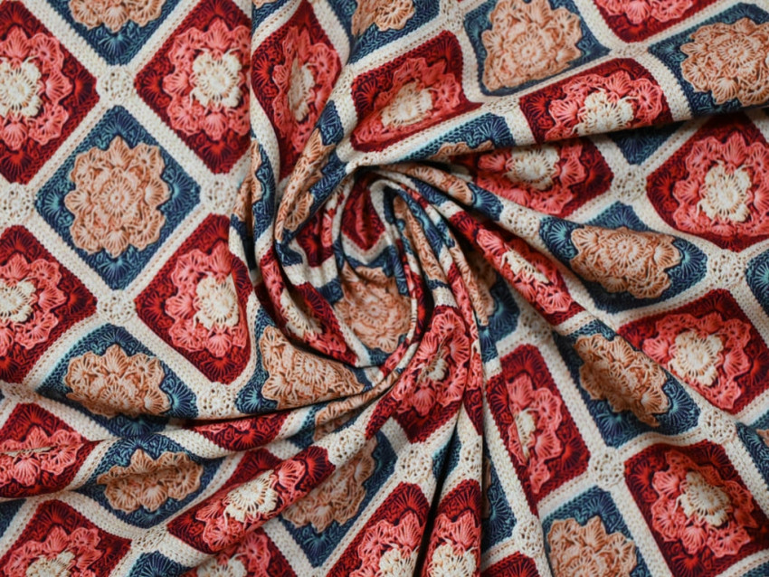 Este tejido de popelín 100% algodón destaca por su sorprendente estampado digital que imita con gran realismo cuadros de crochet en tonos cálidos. Ideal para proyectos con estética artesanal sin renunciar a la facilidad de confección que ofrece el algodón.