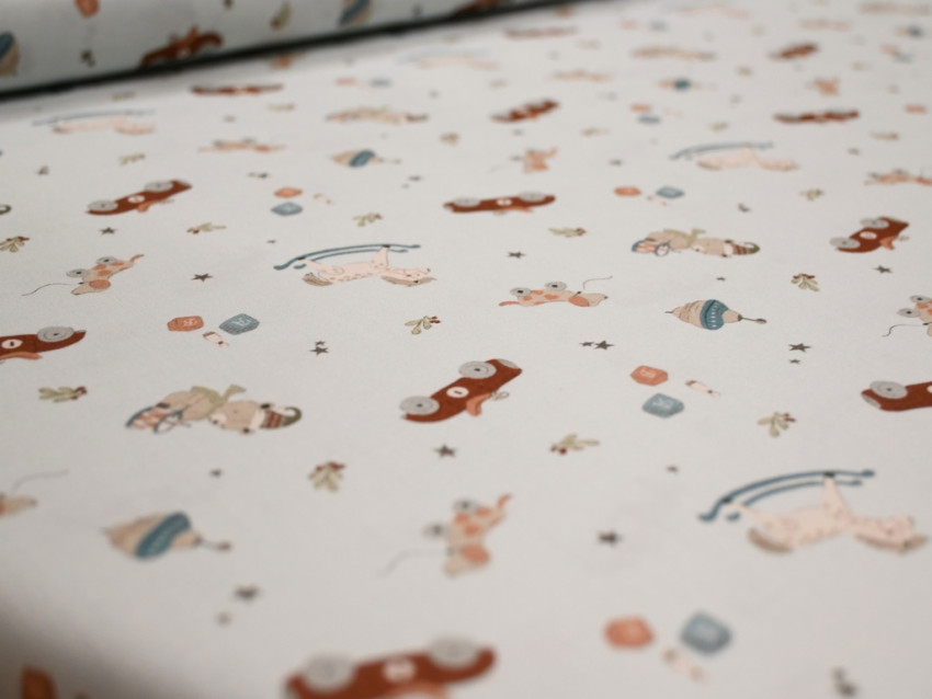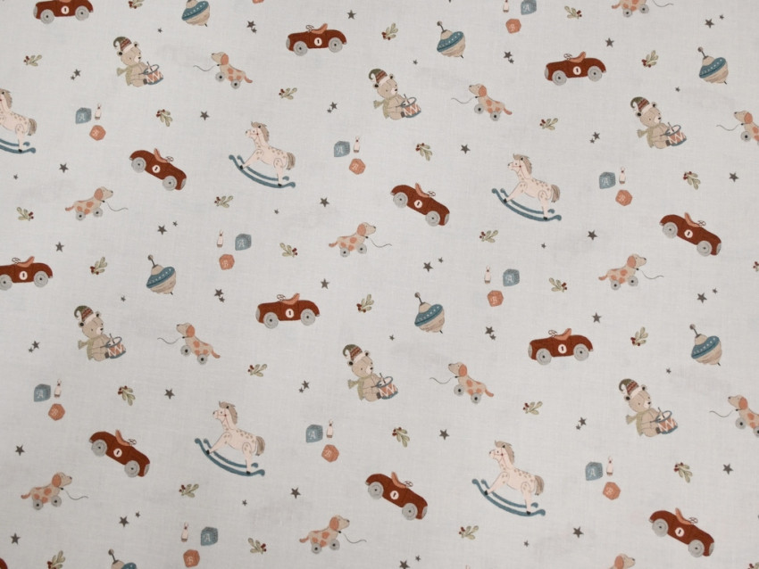 Popelín 100% algodón con un divertido estampado infantil de juguetitos. Suave, ligero y transpirable, ideal para confeccionar prendas y accesorios para los más pequeños. Certificación OEKO-TEX que garantiza su seguridad y calidad.