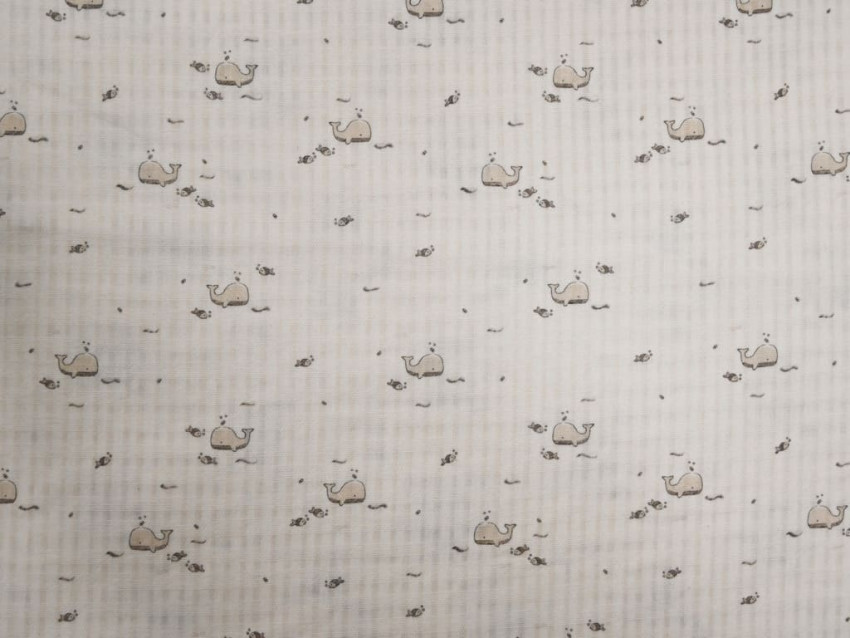 Algodón 100% con estampado de ballenas y pececitos, ideal para moda infantil y textiles del hogar.