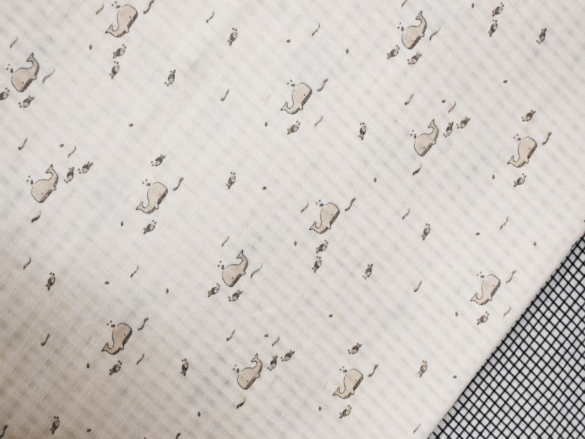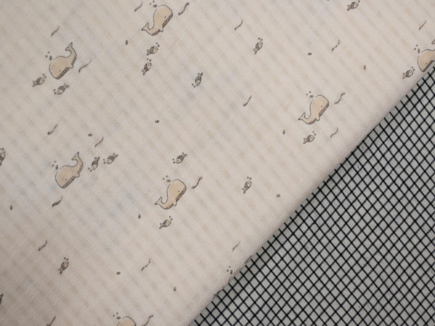 Este tejido estampado de ballenas se coordina perfectamente con el tejido de cuadros ventana, lo que permite jugar con contrastes y combinaciones en prendas o textiles para el hogar. Se pueden crear conjuntos de sábanas con detalles en cuadros, ropa de bebé con interiores en estampado vichy o incluso decoraciones armoniosas para habitaciones infantiles.