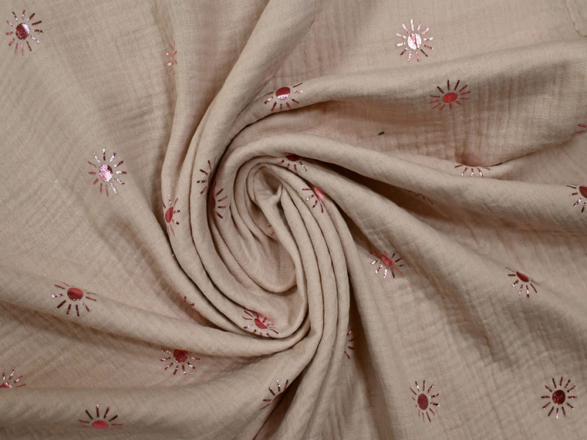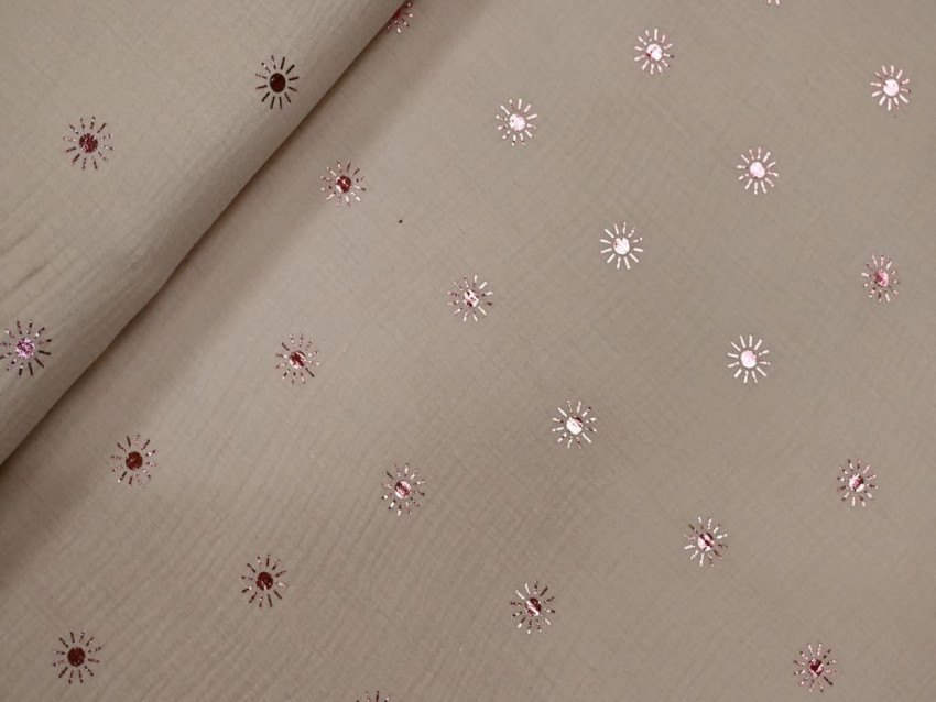 Muselina de algodón 100% con estampado de soles en foil rosa metalizado.
