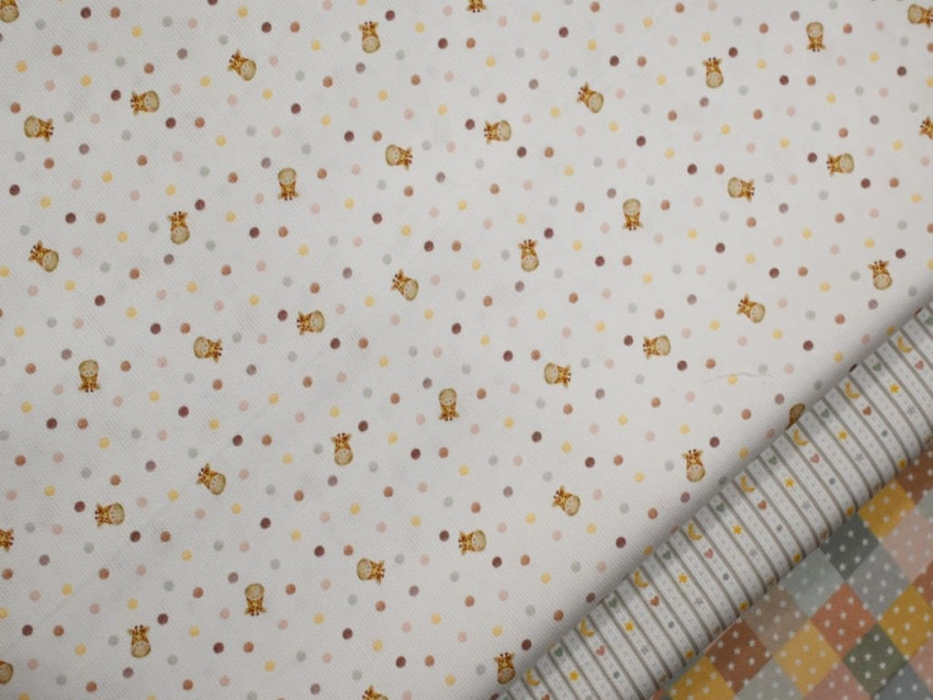 Este piqué de 100% algodón, con un gramaje de 170 gr/m² y 150 cm de ancho, es la opción perfecta para confección infantil y puericultura. Su encantador estampado combina pequeños motivos en tonos marrón, beige y mostaza con lunares sobre un fondo blanco, logrando un diseño dulce, neutro y atemporal.
