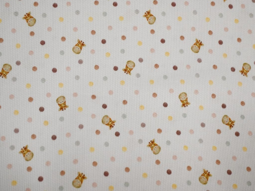 Su diseño infantil con pequeños dibujos y lunares en tonos pastel sobre fondo blanco es ideal para ropa de bebé, sábanas y accesorios. Suave, transpirable y perfecto para pieles delicadas.