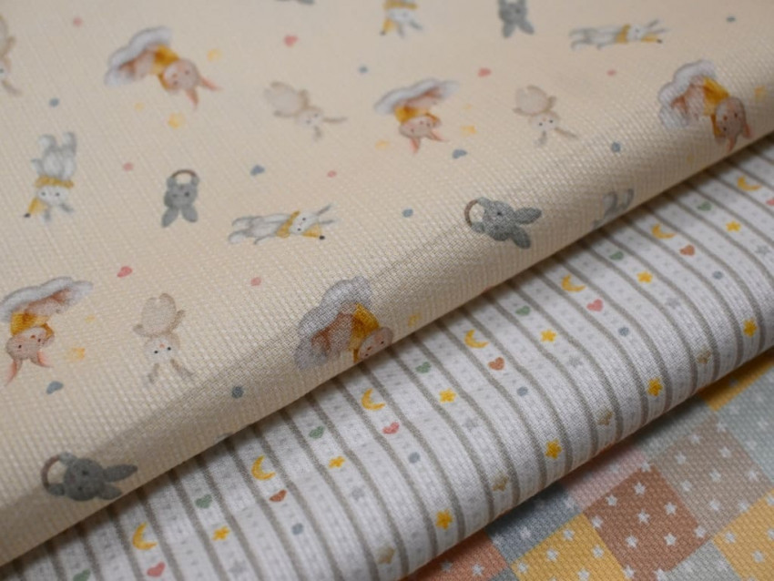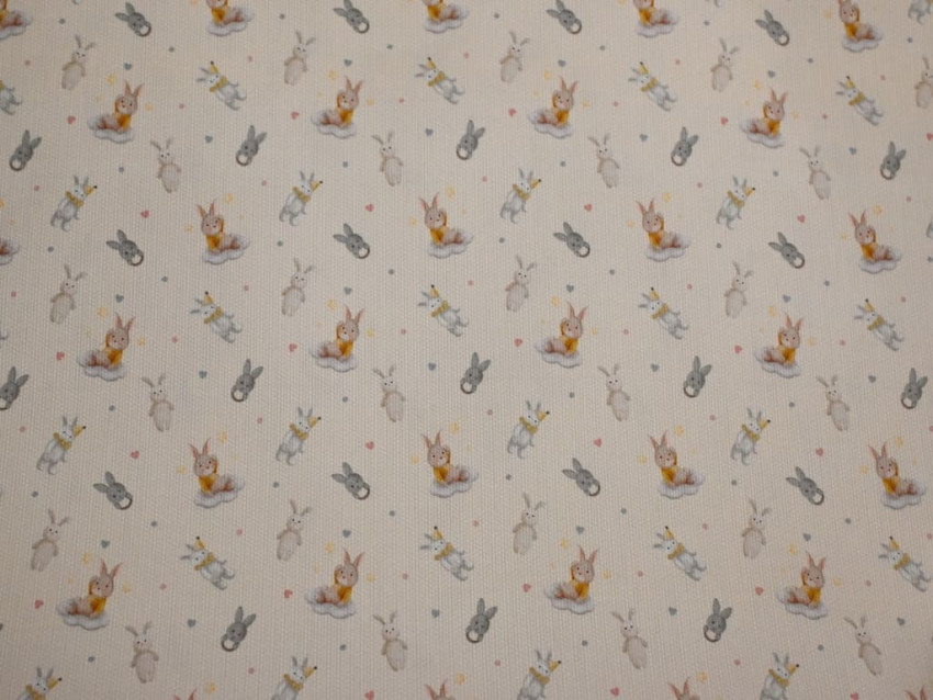 Su tierno diseño infantil con conejitos y estrellas en tonos pastel es ideal para confección de ropa, sábanas y accesorios de bebé. Tejido transpirable, suave y delicado con la piel.