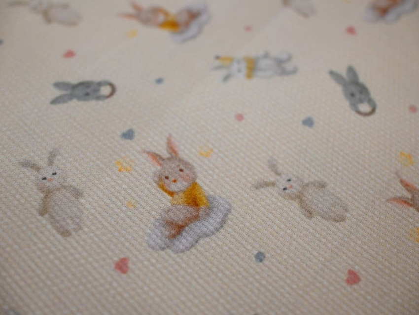 Este piqué infantil con conejitos es una opción ideal para mamás, modistas y creadores que buscan un tejido adorable, seguro y de alta calidad para confecciones infantiles y textiles de bebé.
