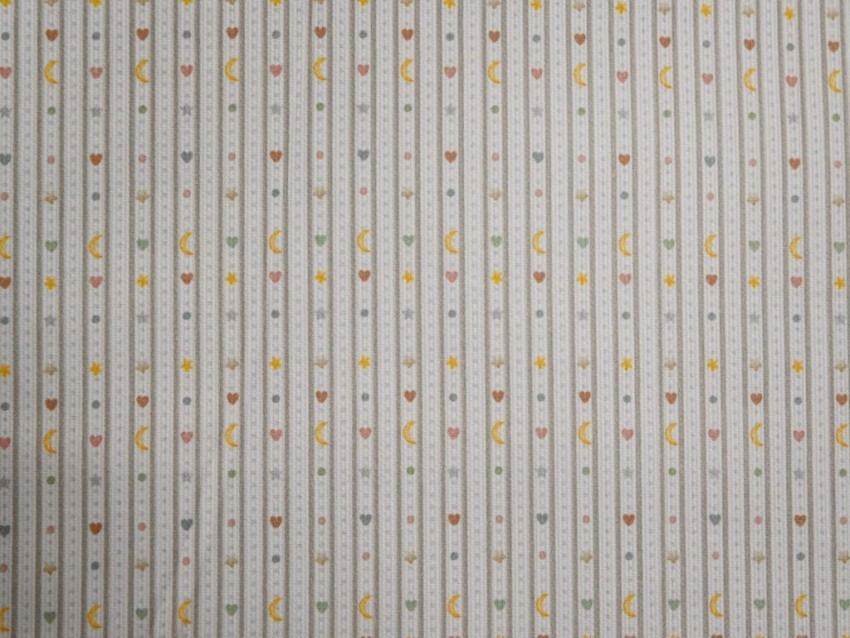 Este piqué de 100% algodón, con un gramaje de 170 gr/m² y 150 cm de ancho, es ideal para confección infantil y puericultura. Su diseño presenta un estampado de líneas verticales con pequeños detalles de lunas, estrellas y corazones en tonos suaves de amarillo, beige, verde y marrón, sobre un fondo claro, logrando un estilo delicado y atemporal.